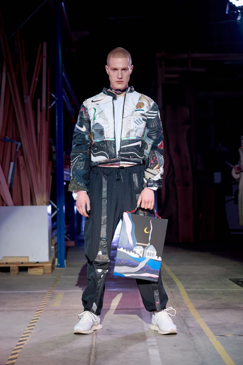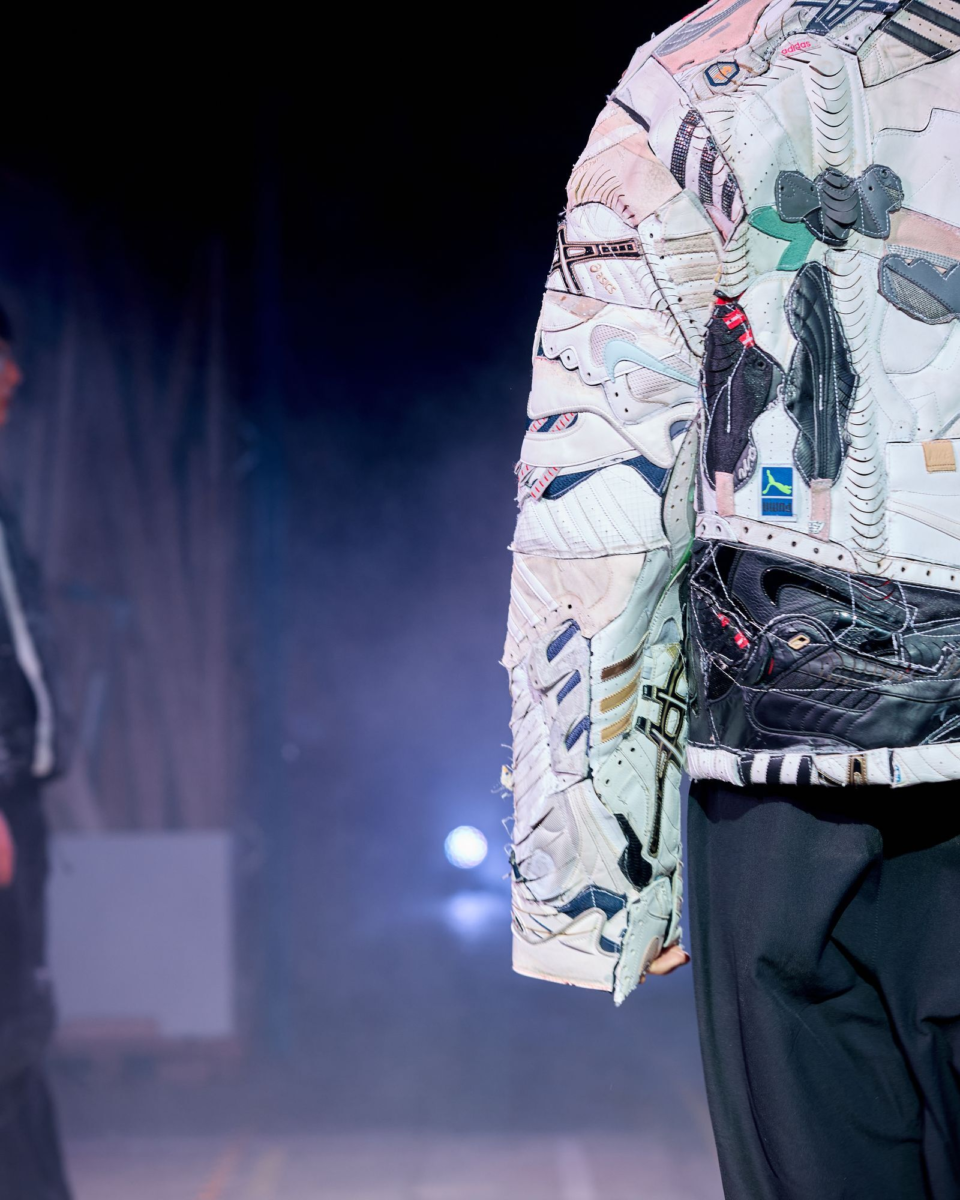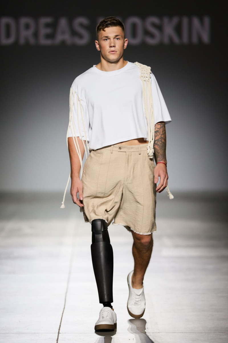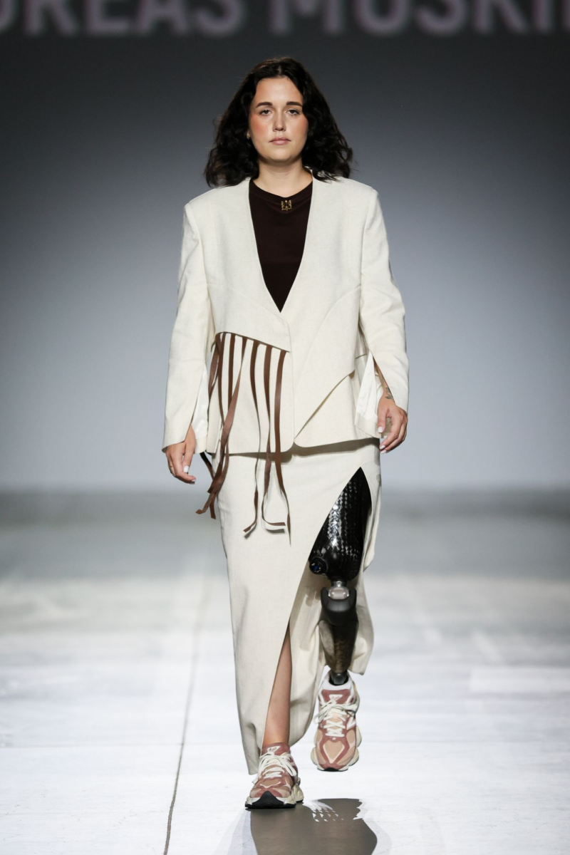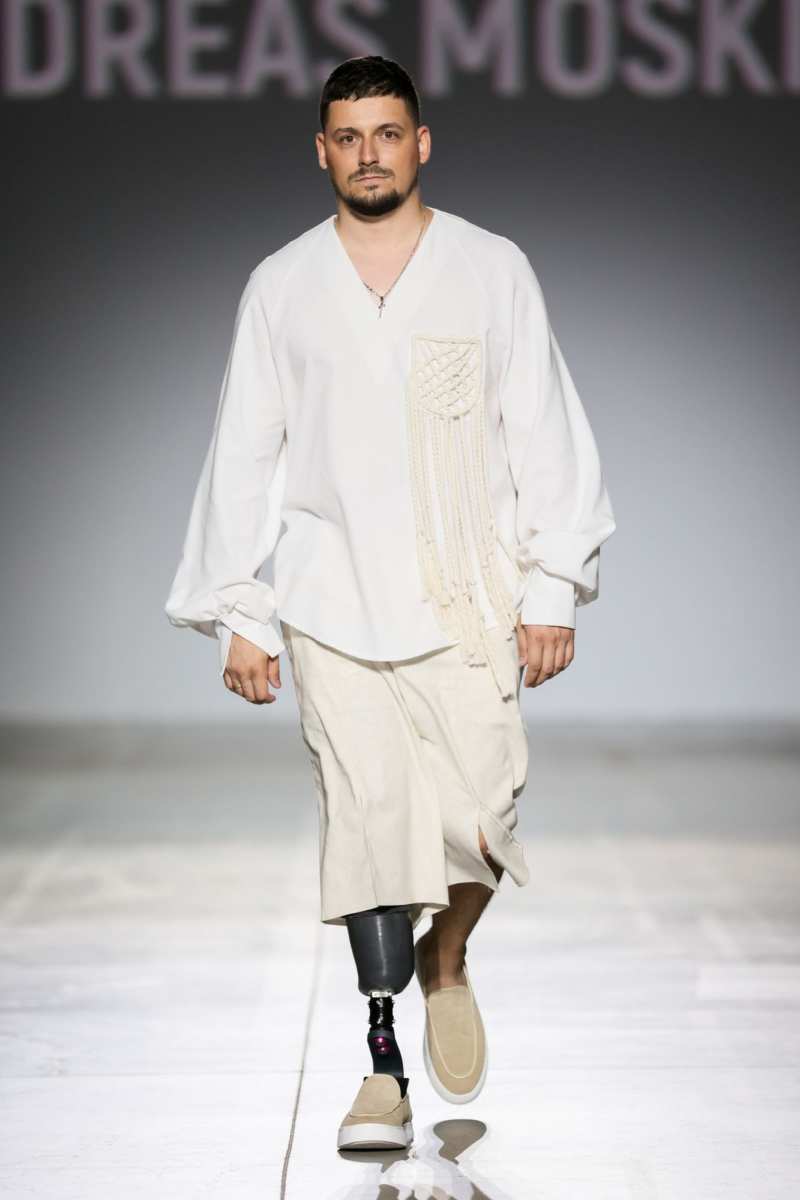 Nadya Dzyak (@nadyadzyak), a Ukrainian fashion designer who spends part of her time in Vienna, has made a name for herself with her experimental fashion. Her collections blend Ukrainian tradition with modern style—20 percent of the proceeds go directly to the Ukrainian army for medical supplies and food. At her latest collection showcase during Ukrainian Fashion Week in September 2024, female war veterans walked the runway in elegant prêt-à-porter dresses. War-wounded individuals with prosthetics also took part in Andreas Moskíns show. (@andreasmoskin_official)