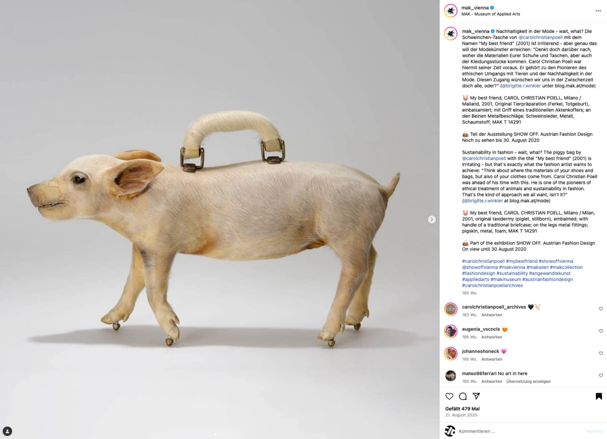„My best friend“ - a macabre declaration of love and arguably one of the most provocative handbags in fashion history. In 2001, Austrian fashion designer Carol Christian Poell created this unique piece from a stuffed piglet, radically challenging the boundaries between fashion, art and ethics. In 2020, it was part of the SHOW OFF exhibition at MAK Vienna.