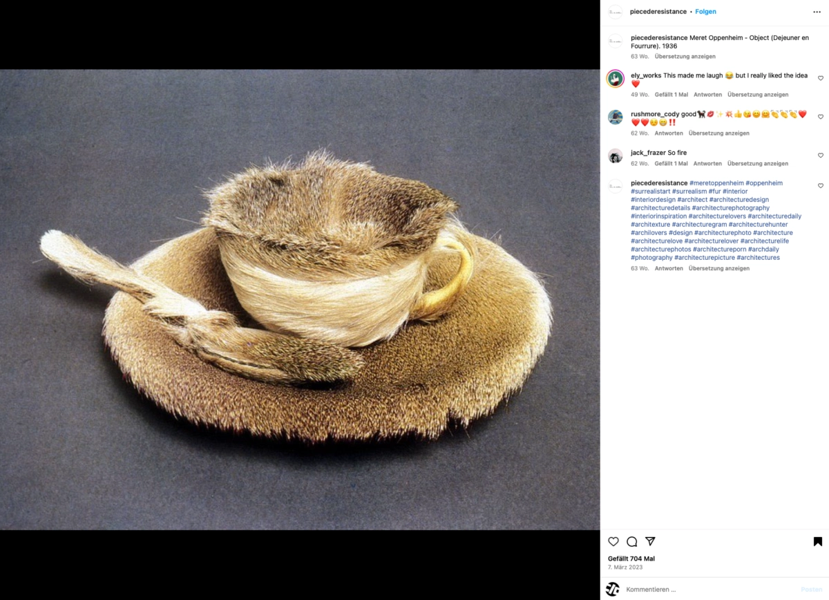 The artwork „Object (Le Déjeuner en fourrure)“, known in German-speaking countries as „Frühstück im Pelz“, was created in 1936 by the German-born surrealist Méret Oppenheim (*1913-1985).