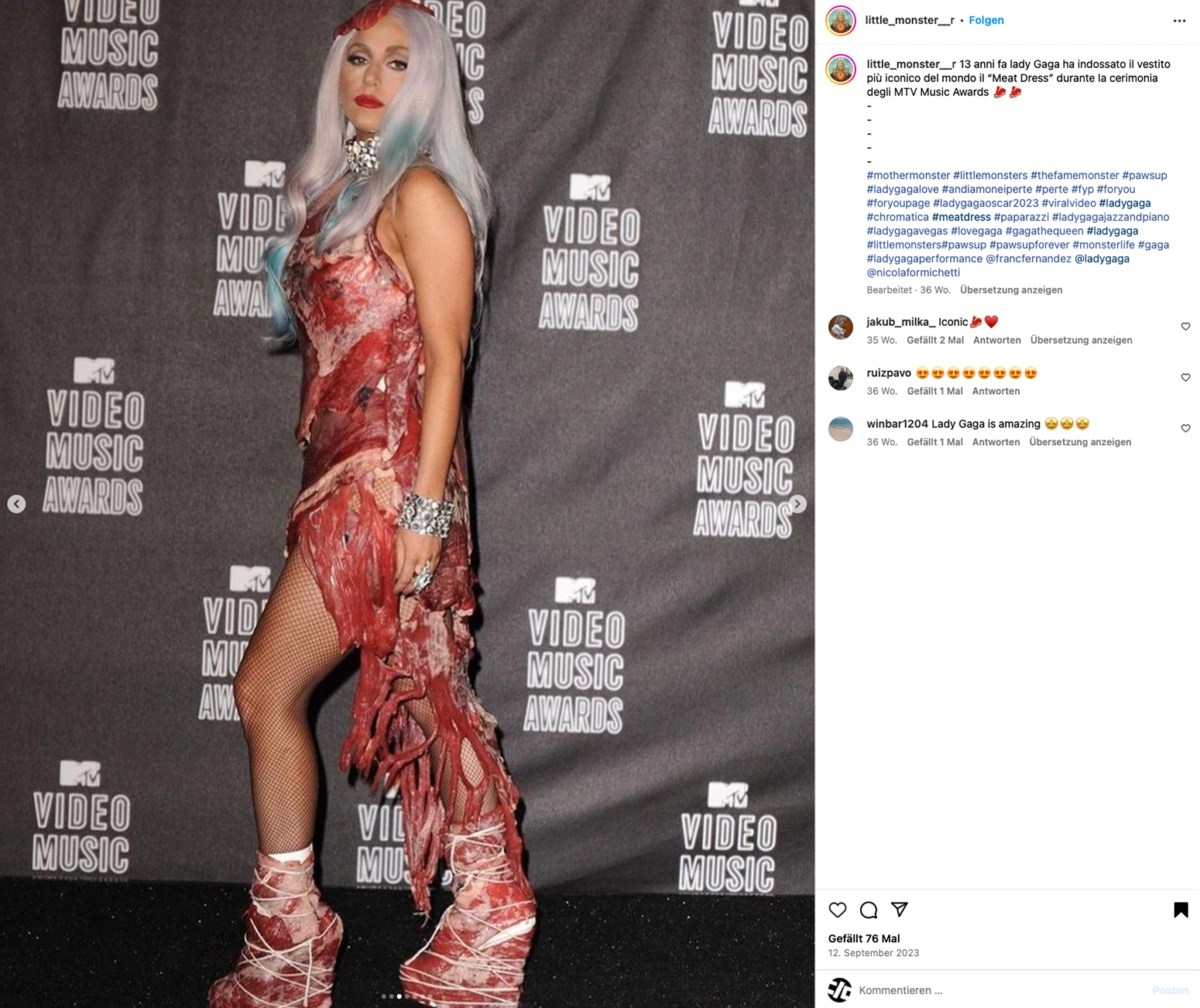 The legendary meat dress by American designer Franc Fernandez, worn by Lady Gaga at the 2010 Video Music Awards when she received the Video of the Year Award for „Bad Romance“, was professionally preserved after the performance - dried and prepared. Fernandez told USA Today that he sourced the beef from his family's slaughterhouse and spent two days crafting the dress.