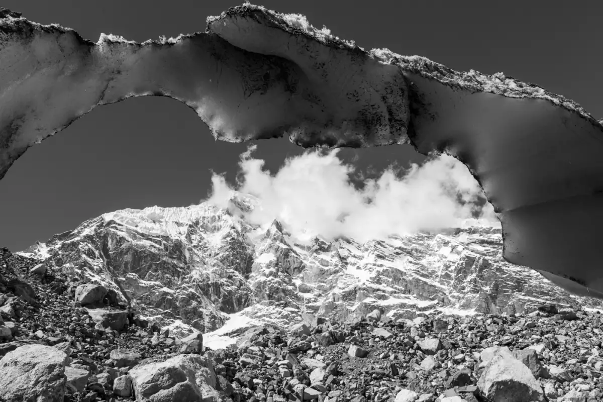 You smell the thin air in the mountains. There is purity, visually and in all the senses. You can hear the sound of mountains: rock and water. Clean ice glaciers sound different from glaciers covered with debris. It's a very particular sound, hearing the rocks shifting and colliding under your feet as you walk on them. Walking on rolling stones requires concentration and balance, it is like a meditation. When you walk on the ice with crampons, you also hear the thinnest ice on the surface being crushed by the crampon spikes. Sometimes we hear avalanches from higher glaciers bringing snow down into the valley. The air in the mountains smells fresh – and it's usually very cold!