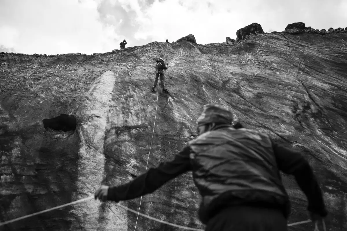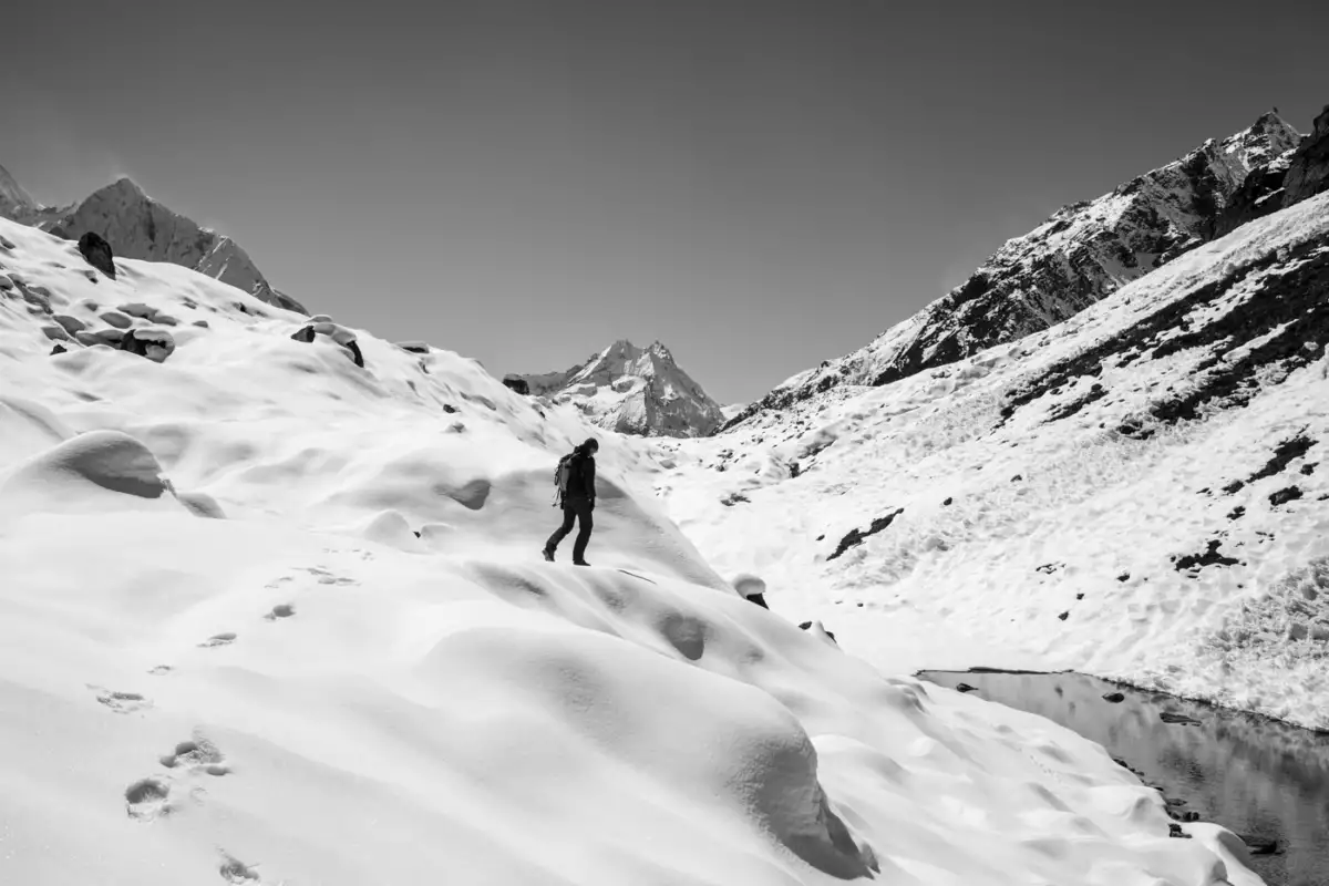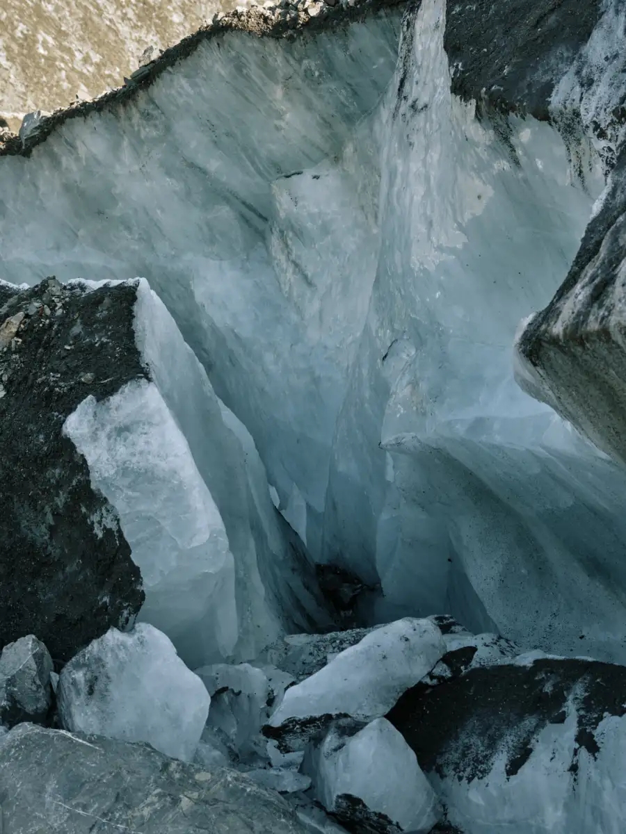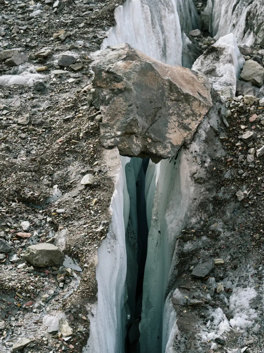 The consistency of the ice and the fact that they are often located in beautiful, untouched landscapes. Their majesty, their material. The fact that you have to walk many days and kilometers to reach them. The thin air, the effort required to reach them, the respect you must have for them. It is hard to explain why a glacier is so beautiful; its size and dynamics give it a special presence that you feel when you are close to it. They make you feel small.