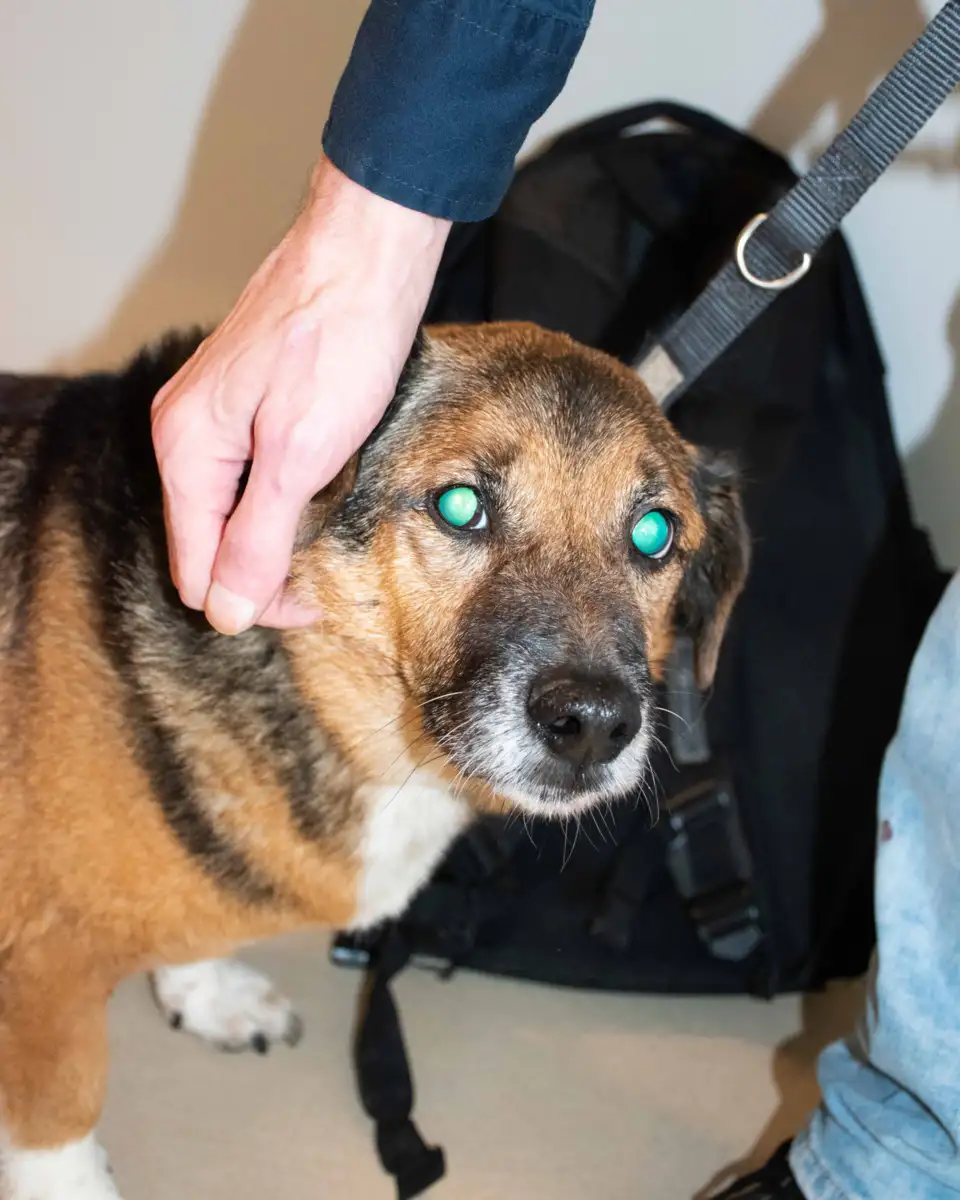 Time flies by, the practice will soon be closing. David and his eleven-year-old mongrel Pancake are one of the last to be seen today. He has to wait a short while until he is called. He sits down on the front doorstep, where he explains in English that he rescued his four-legged friend from the streets of Barcelona. Pancake’s condition at the time was deplorable. He had been beaten with sticks and stones, was severely emaciated, sick, and suffering from a bad fungal infection.