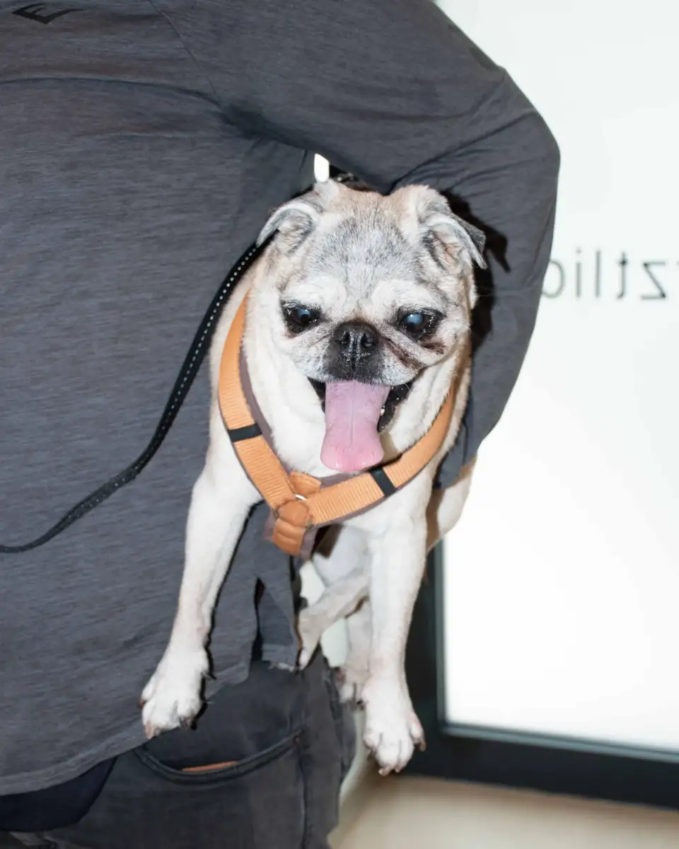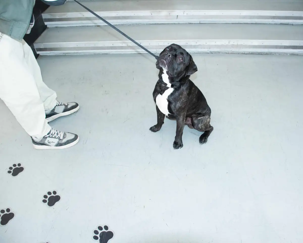 It’s a good thing that border collie Chester, a notorious pug hater, is no longer here: Guiliano comes in the door with his young black pug Rocky. He’s here because Rocky needs deworming. Sometimes his eyelid pops out, his friends told him that it could be a sign of worms. Rocky has shiny fur and looks extremely well-groomed. “My best friend in the world. Since I’ve had him, I feel good. He understands me better than people and protects me.” Sometimes, he just lies down on the floor with his dog and falls asleep next to him when he gets too lonely in bed. One day, Rocky ran up to a Staffordshire that was tied to a tree. The dog bit into Rocky’s neck, says Guiliano. It took ten minutes to free him from its clutches, an eternity. Fortunately, it had only bitten into Rocky’s skin.