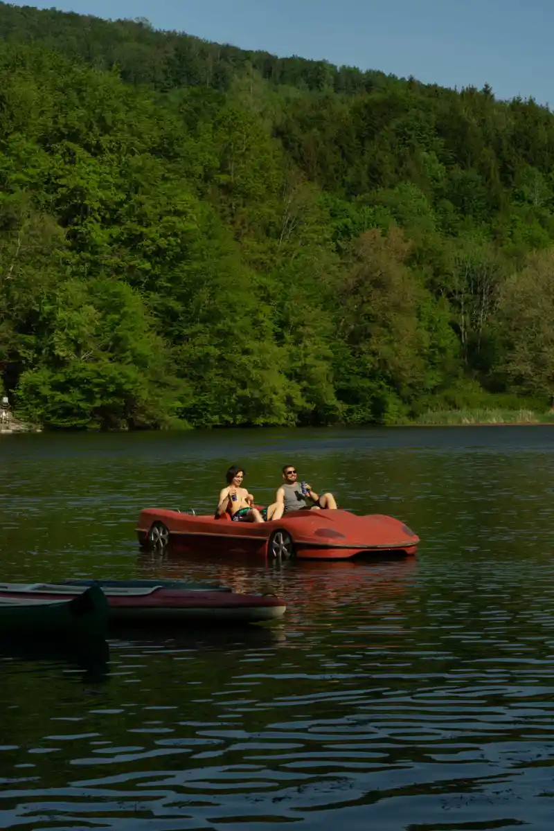 Lake Thal is also where, in 1986, Schwarzenegger proposed to John F. Kennedy's niece, Maria Shriver, on a small rowboat. The "Promise Boat " still lies in state next to the lake, as an exhibit and memento, outfitted with a faded photo of the young couple. Walking along the shore, we decide to rent a boat ourselves. We've chosen the most beautiful day of the year for our excursion. The summer air is heavy, it's supposed to rain again tomorrow. I can picture him well, 13-year-old Arnie, very tall for his age, walking down to the lake on a summer afternoon just like this one. A young man who wanted to set out into the world and leave his provincial hometown behind—yet who never quite left this magical place.