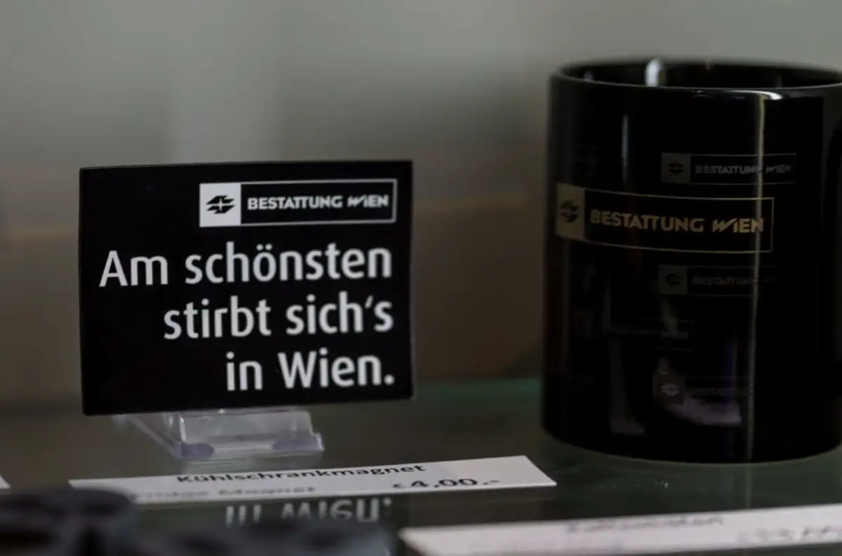 Das Wiener Bestattungsmuseum ist bekannt für die gewagten Statements auf seinem Merchandise. Der Bestseller: ein Zigarettenetui mit dem Slogan „Rauchen sichert Arbeitsplätze!“.