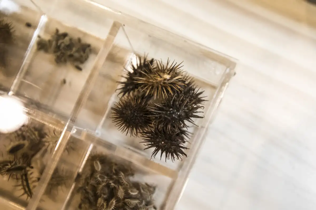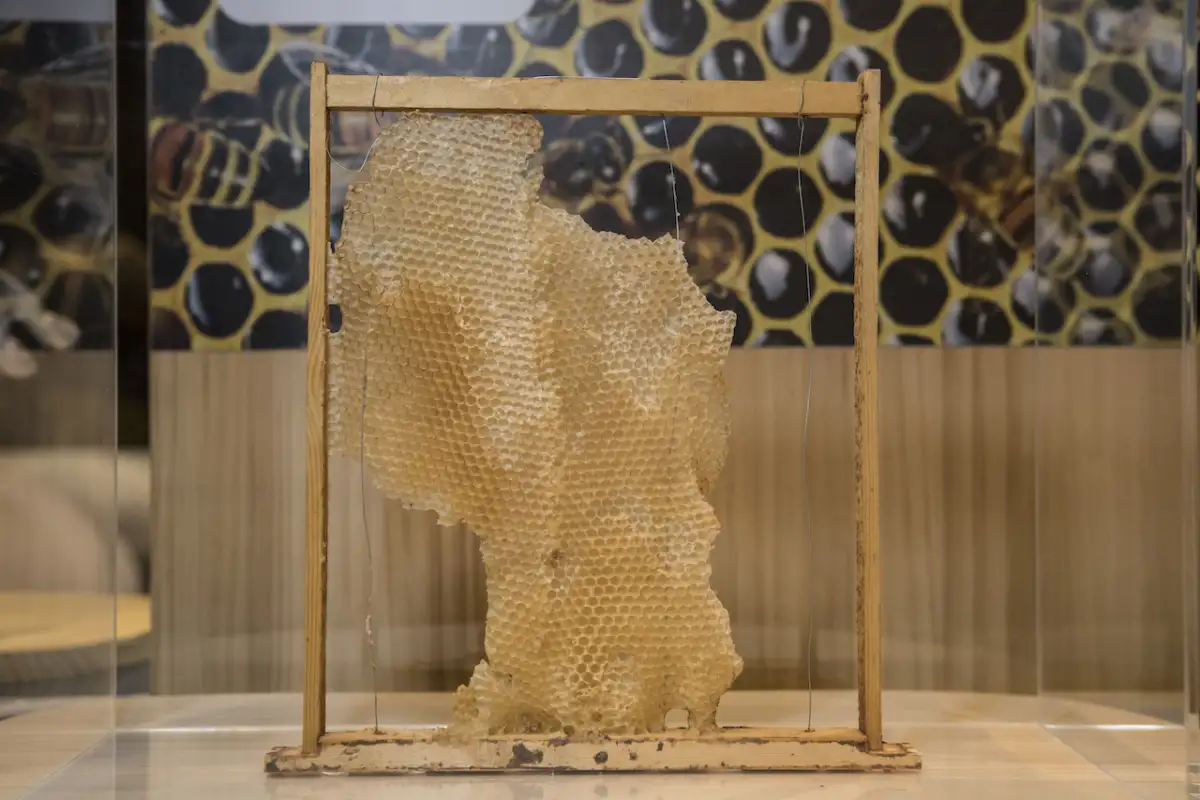 Ausstellungsansichten aus „Bioinspiration“ im Technischen Museum: Links sieht man Früchte einer Klette, die als Vorbild für den Klettverschluss dienen. Rechts: Die Bienenwaben zeigen, wie effizient das Sechseck ist, weshalb es auch in der Raumfahrt zum Einsatz kommt.
