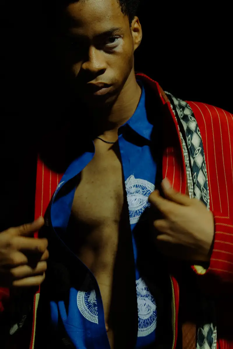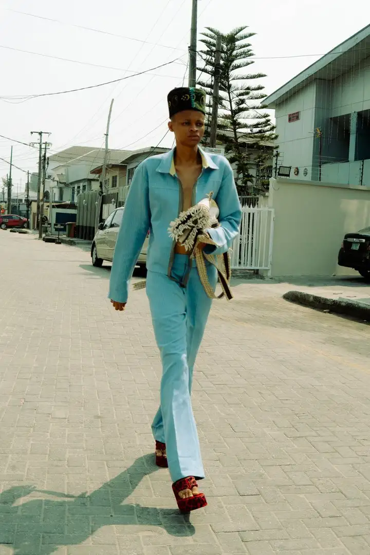 Während Corona wurde die nigerianische Gesellschaft allein gelassen, sie wurde ärmer und ärmer. Ich wollte eine Botschaft mit meiner Kleidung an die Regierung senden. Ich designte Blazer mit Gürtel, die Regierungsbeamte während der Diktatur in Nigeria trugen. Diese Kollektion sollte an diese schlimme Zeit des Stillstands erinnern und wachrütteln. Ich verwendete Stoffe älterer Kollektionen, damit sie sich von den echten Uniformen der Regierungsbeamten unterscheiden.
