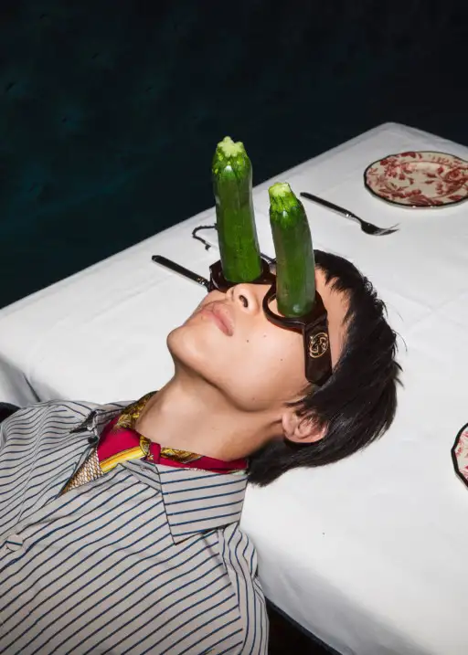 Auf dem Bild oben ist Max Siedentopf zu sehen, auf den beiden Bildern unten die Werbekampagne, die er für die Eröffnung von Guccis erstem Restaurant „Gucci Osteria“ fotografiert hat – dieses Mal aber nicht mit dem Handy.