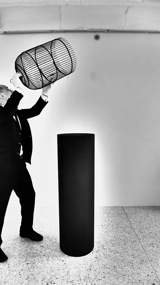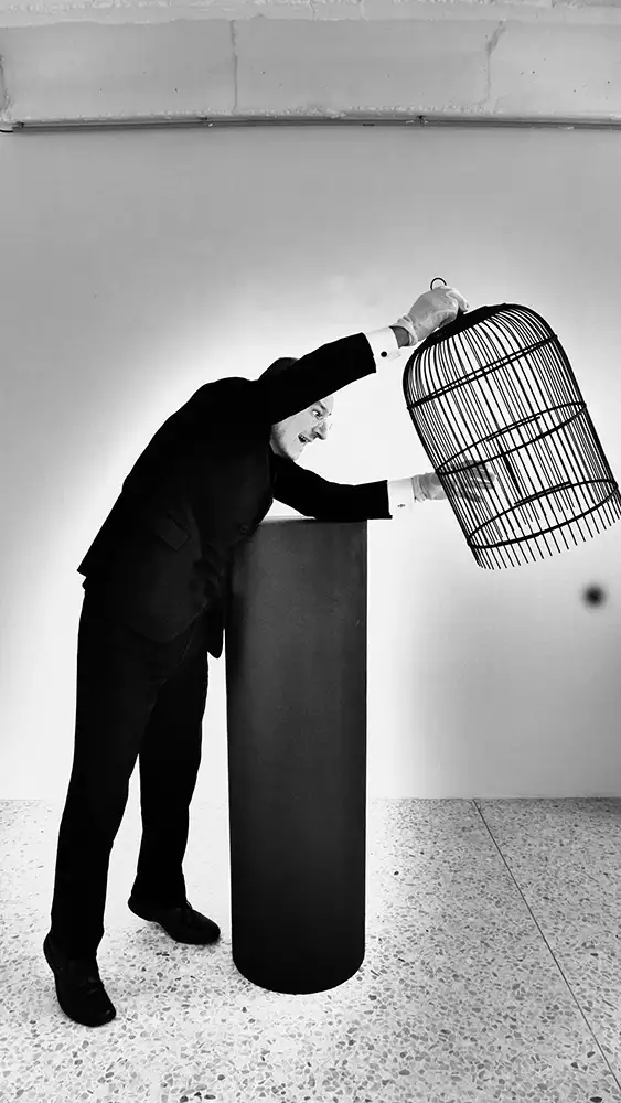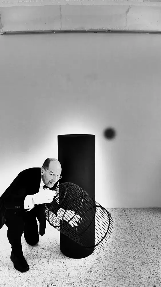 Die Arbeit „Chasing ideas with a birdcage“ (hier der Künstler selbst mit Käfig) stellt die Frage, ob man Ideen fangen kann. Kann man?