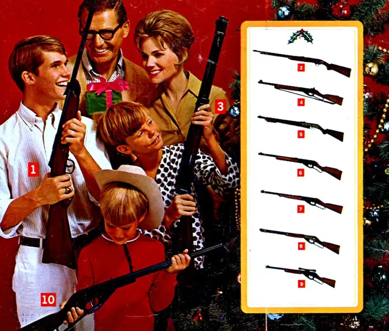 einem Plakat sieht man eine glückliche Familie unter einem Weihnachtsbaum, jeder mit einer Waffe in der Hand. Ich war