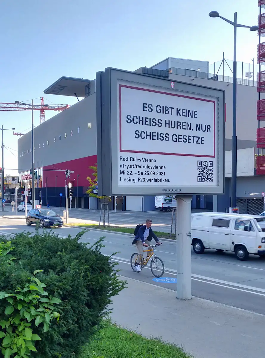 Dass die Red Rules Conference und Performance im 23. Bezirk stattfand, ist kein Zufall, denn neben dem 21. Bezirk befindet sich dort der einzig erlaubte Straßenstrich Wiens. Hier zu sehen ist eine Ankündigung der Sex Work Conference an der Breitenfurter Straße in Liesing.