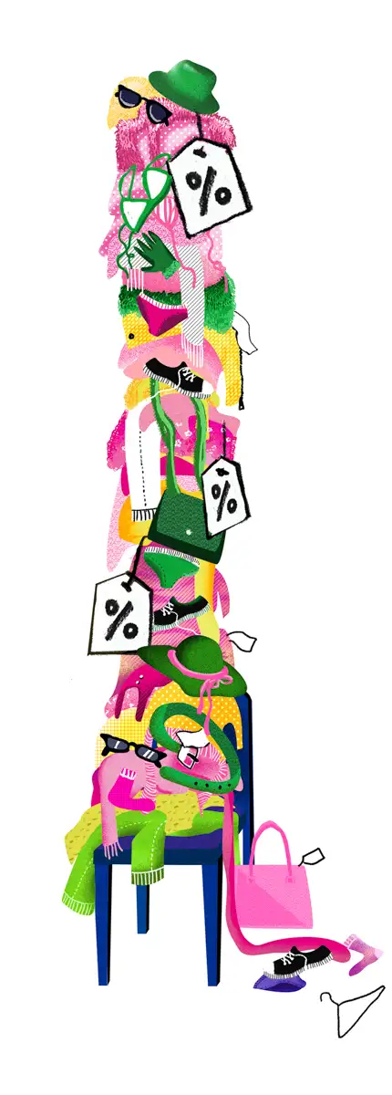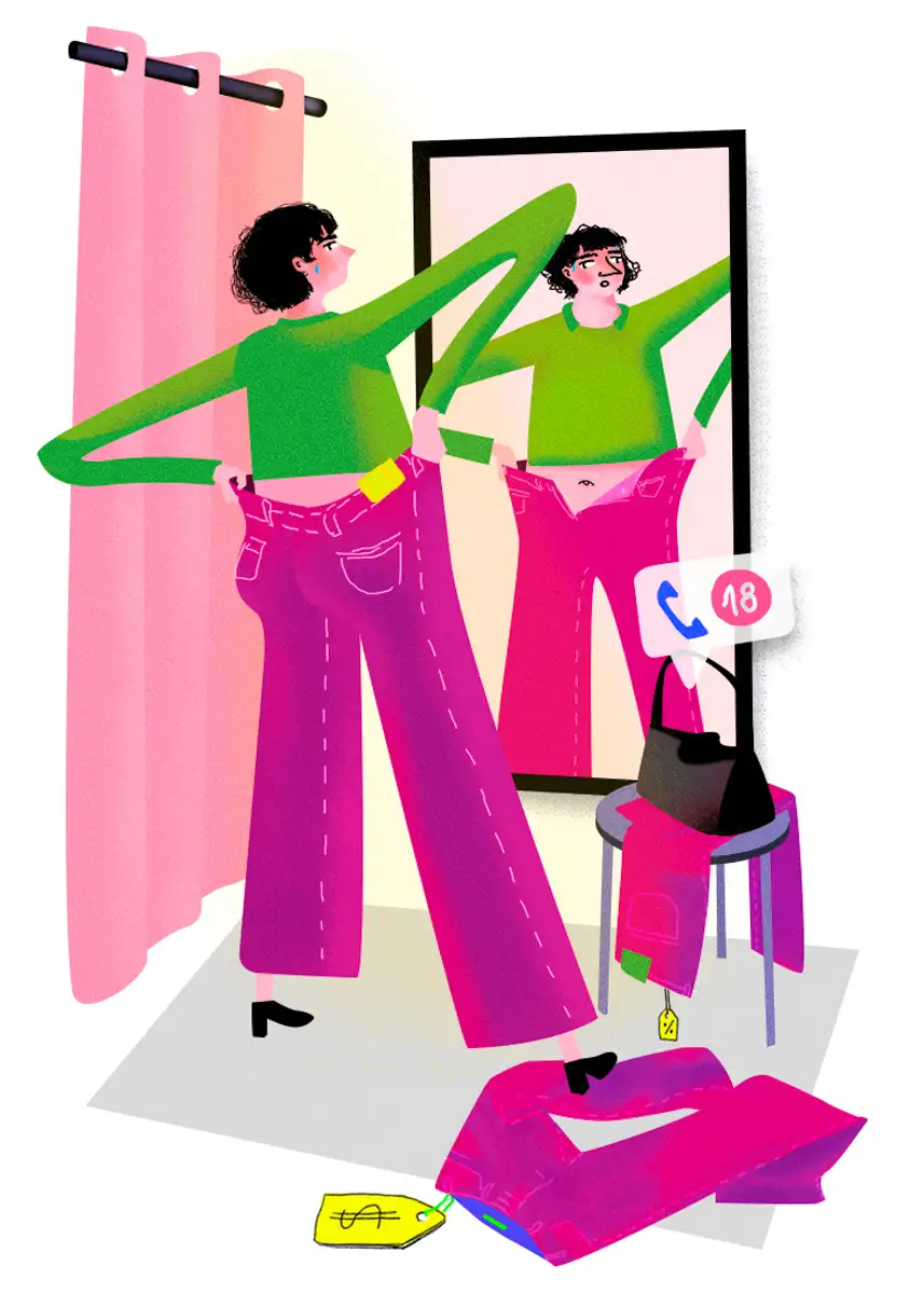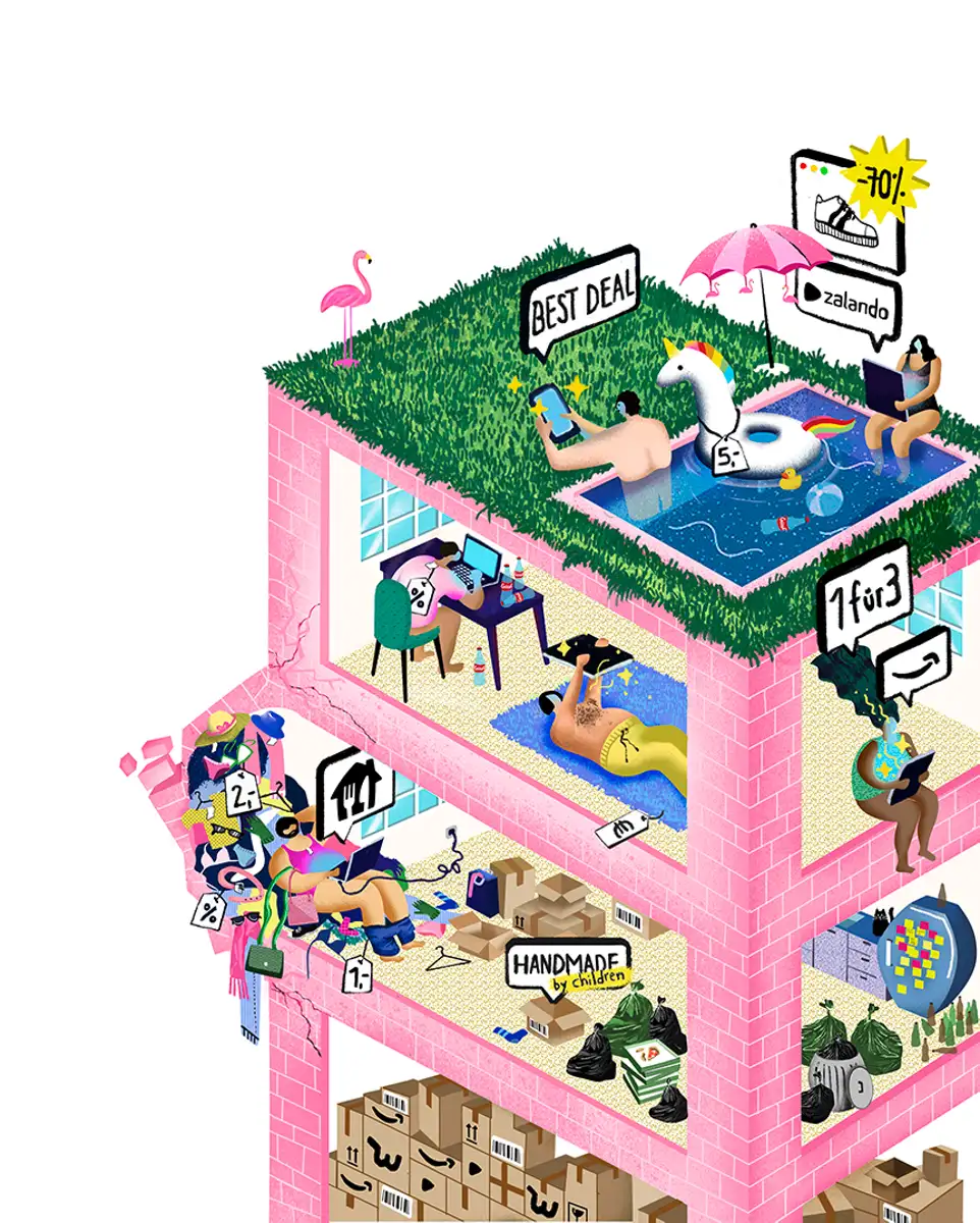 Illustrationen sind von Emma Peinhopf & Linda Zimmermann. Wenn wir eine Hose anprobieren: wir drehen uns und schauen, sitzt sie? Ist es ein robustes Material? Wie kann ich sie kombinieren? Wie viel kostet die? Eine faire Produktion ist wohl vielen wichtig, aber im Moment des Anprobierens sind auch hundert andere Sachen wichtig.