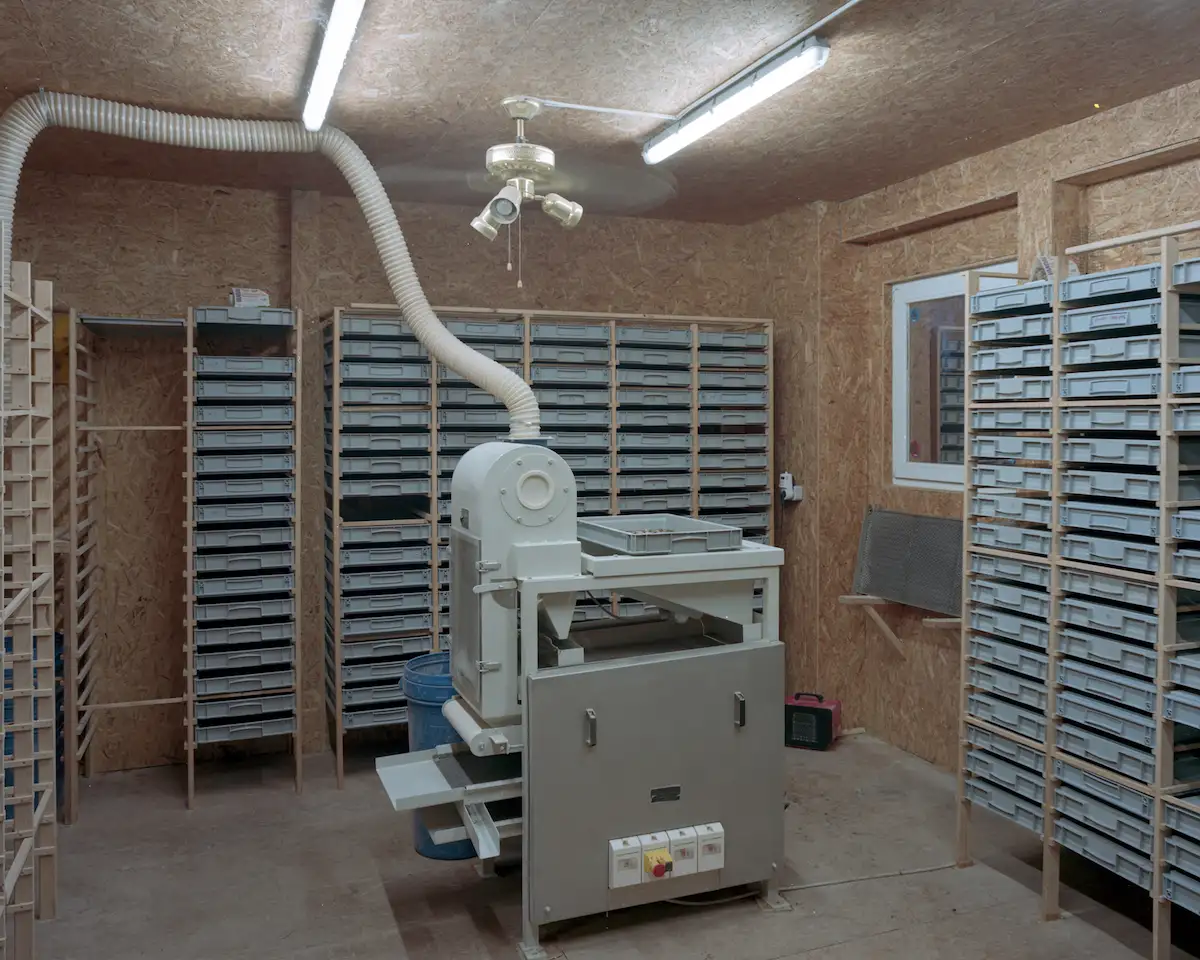 Inzwischen erledigt das eine Sortiermaschine. Bis vor einem Jahr machten wir das noch händisch, da schafften wir maximal fünf Kilo pro Stunde. Die Maschine erledigt das über Fünfzehnfache, also etwa achtzig Kilo die Stunde. Diese Apparate haben wir übrigens – basierend auf den Erkenntnissen asiatischer Insektenzuchtvorreiter – gemeinsam mit steirischen Sondermaschinenbauer entwickelt.