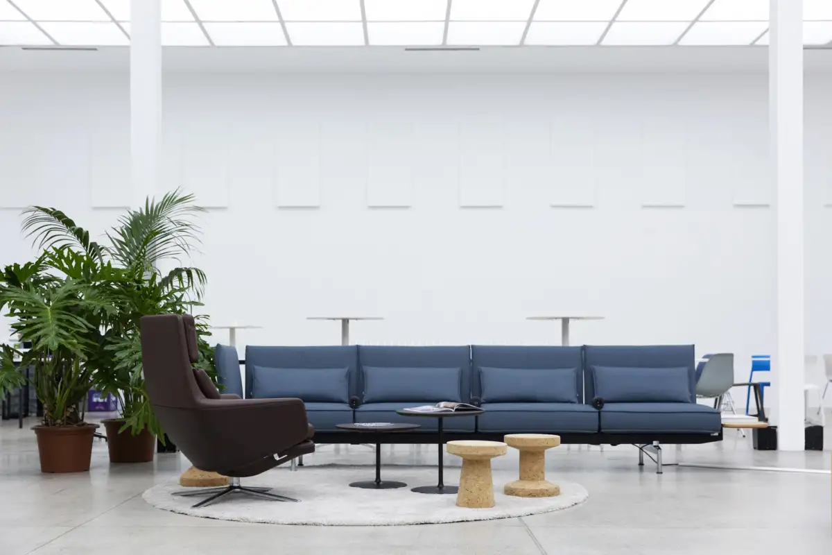 Ein Modularsystem – die Sofas können durch kleine Tische zum Arbeiten sowie Steckdosen und Ladestationen erweitert werden. Man kann die Sitzeinheiten auch leicht mit Trennwänden voneinander abgrenzen, um Privatsphäre zu schaffen. Als möglichen Kontext stelle ich mir Flughäfen, Coworking Spaces oder Lobbies von großen Firmen vor.