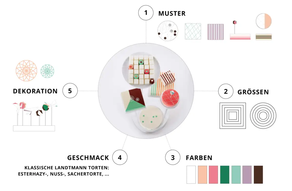Marzipanfiguren und Schnörkel gibt es im Torten-Baukasten von Wiener Café Landtmann, den Ambrosz und Santorso designt haben, nicht. Stattdessen setzen sie auf klare Formen und bunte Farben.