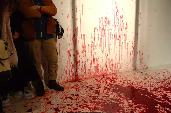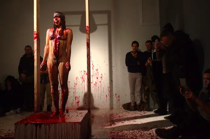 Regina José Galindo: Das Publikum hat sich Zeit gelassen. Der Raum, in dem die Performance stattgefunden hat, war klein. Ich schätze, die Zuschauerinnen haben gespürt, dass durch das Ziehen am Seil jede befleckt werden könnte. Und so war es dann auch, das Blut hat alle vollgespritzt.