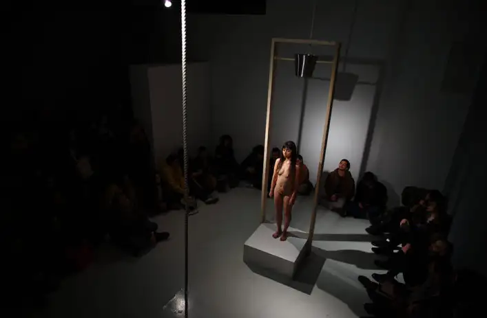 Lara Ritter: Bei der Performance „La Sangre del Cerdo“ bist Du nackt unter einem Eimer Blut gestanden, an dem ein Seil befestigt war. Wie lange hat es gedauert, bis jemand daran gezogen hat?