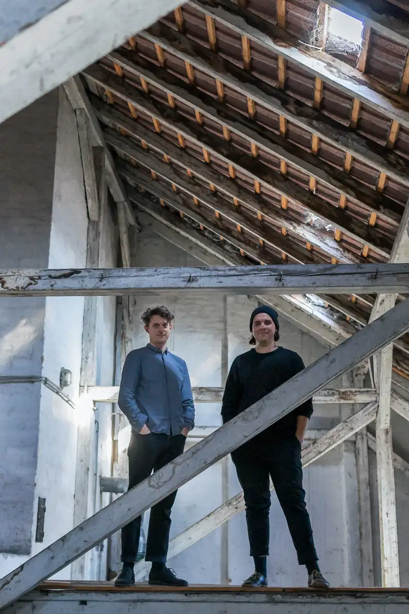 Paul Pibernig und Sebastian Gansrigler beim „C/O VIENNA“-Fotoshooting auf unserem Dachboden: Wir haben das weiche Herbstlicht genützt.