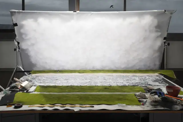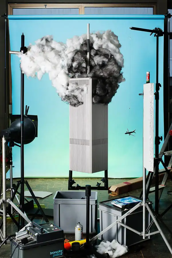 Gefakter Crash aus Watte und Schaum? Bei den Arbeiten von Cortis & Sonderegger geht es um die plastische De- und anschließende Neukonstruktion von Foto-Ikonen. Sie arbeiten mit in die Tiefe gebauten Schaubildern, sogenannten Dioramen. Titel: Making of „9/11“ (by Tom Kaminski, 2001), 2013.