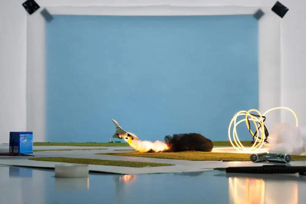 Das Drumherum und die Arbeitsprozesse werden in ihren Fotos immer mit abgebildet, um die Illusion sichtbar zu machen. Hier das Making-of der brennenden Concordia. Titel: Making of „Concorde“ (by Toshihiko Sato, 2000), 2013.