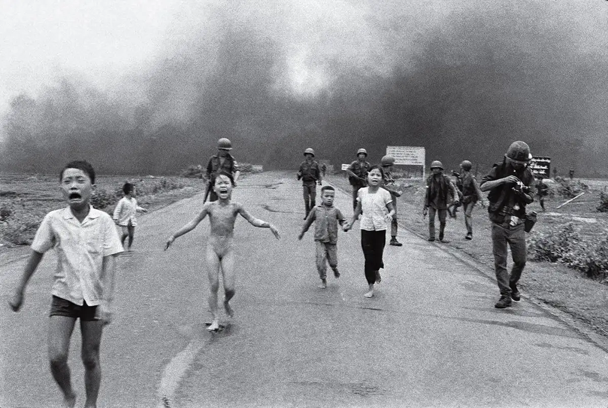 Links: „Auf dem Berliner Reichstag“ von Jewgeni Chaldej. Rechts: Nick Úts Foto des nackten Mädchens Kim Phúc im Vietnamkrieg vom 8. Juni 1972, auch bekannt als „Napalm Girl“. Es erschien auf der Titelseite der „New York Times“.
