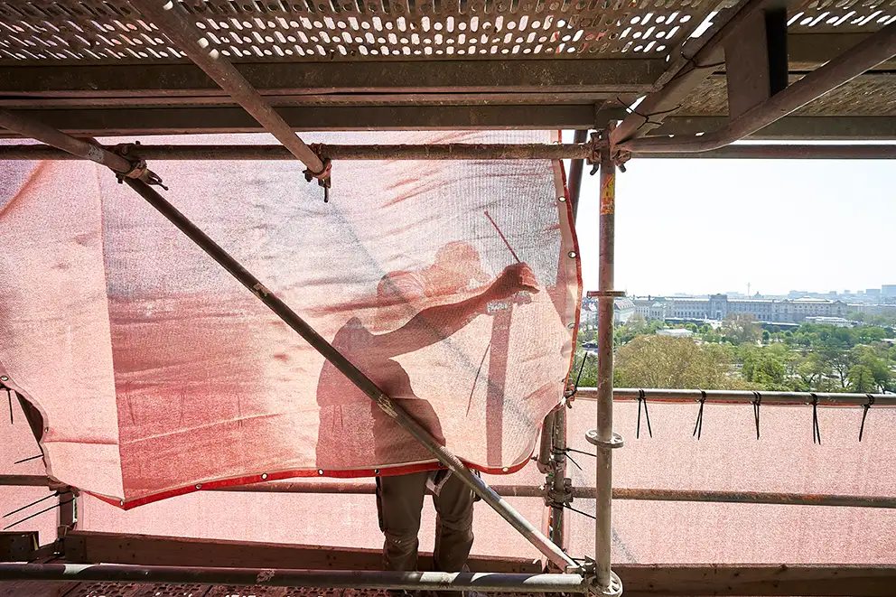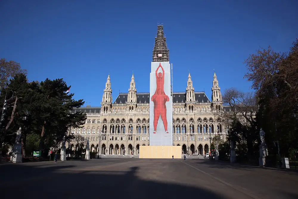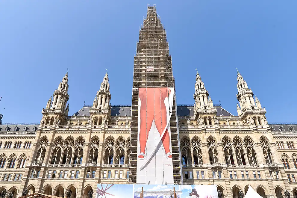 Der Blick aus dem derzeit vom queeren Künstlerduo Ashley Hans Scheirl und Jakob Lena Knebl anlässlich des 100-Jahr-Jubiläums vom „Roten Wien“ verkleideten Rathausturm