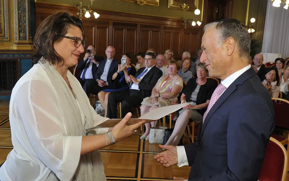 Daily Business: Kulturstadträtin Veronica Kaup-Hasler überreicht Oberkantor Shmuel Barzilai das Goldene Ehrenzeichen für Verdienste um das Land Wien.