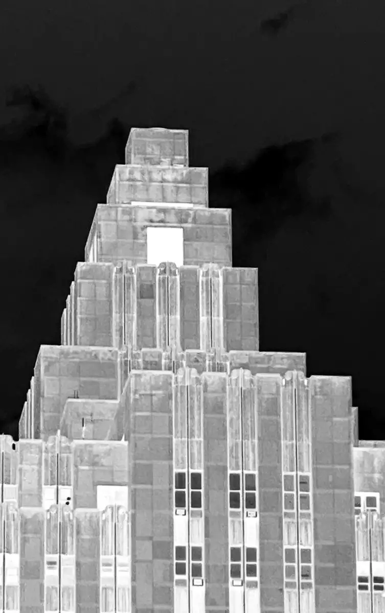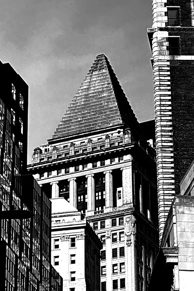 Die ganze Stadt ist voll davon! Eine gewisse Ironie hat es schon, dass das Epizentrum des Kapitalismus auf seinen Hochhausdächern eine tempelartige Infrastruktur hat. Die Fassade der Börse etwa ist ein griechischer Tempel, das Dach nimmt die Form einer ägyptischen Pyramide an! Ob Wassertänke, Handymasten, Aufzugsschächte oder Penthäuser, bei genauerem Blick sind viele Architekturelemente von sakralen Kultstätten inspiriert.