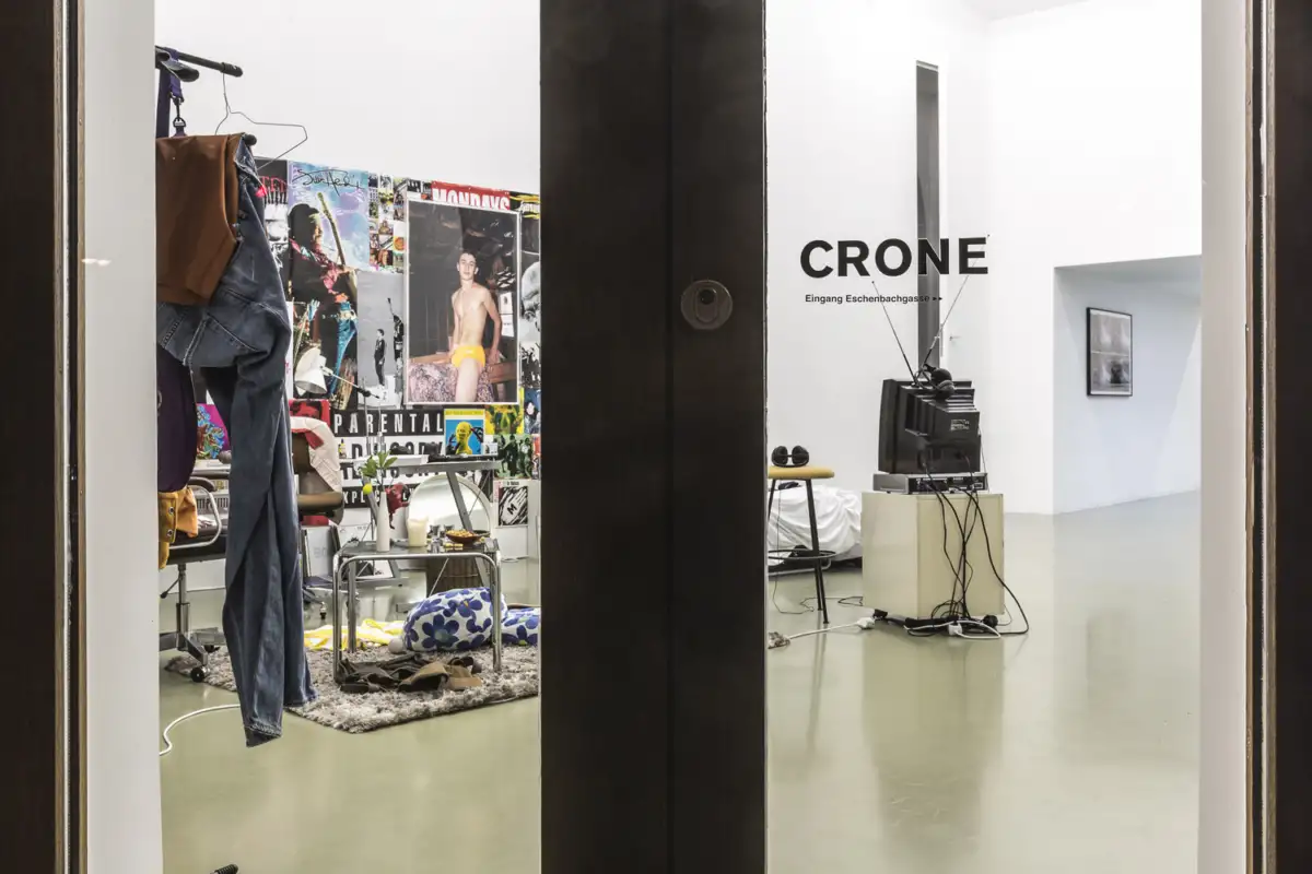 Bild links: Geschäftsführer Markus Peichl, rechtes Bild: Ausstellungsansicht „Jugendzimmer“, kuratiert von Dirk Schönberger, Galerie Crone Wien