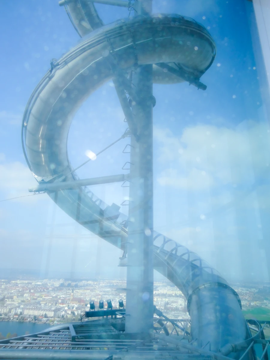Shooten durften wir am wunderschönen Donauturm – auf Europas höchster Rutsche! Rahel rutschte 165 Meter über Wien eine 40 Meter lange Strecke bis auf die Aussichtsebene in 150 Metern Höhe. In nur sieben bis neun Sekunden kann man eine Geschwindigkeit von bis zu 18 km/h erreichen. Nervenkitzel ist vorprogrammiert!