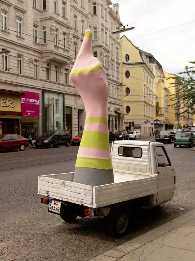 Ja, für Salzburg stricke ich gerade Meterware für die Kostüme der Westside Story, ich produziere aber auch oft für das Theater an der Wien. Wenn ein Stück zum Beispiel in den 40er Jahren spielt und die Hauptdarstellerin einen stilechten Pullover tragen soll, dann kann ich den liefern. Mein prominentester Kunde war sicher der österreichische Künstler Erwin Wurm. Der hat sich ja immer wieder mit Pullovern aus Strick beschäftigt und mit seiner Fähigkeit der Dehn- und Formbarkeit. Für ihn habe ich einige Auftragsarbeiten gemacht. Sehr lustig waren auch die Pullover für die übergroßen erdäpfelartigen Knollen. Für die Malerin Mischa Reska setze ich ihre Gemälde 1:1 in Strickbilder um. Aus ihren Sumoringer-Motiven stricke ich Schals.
