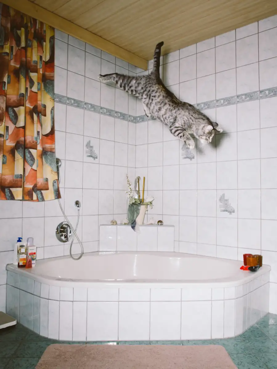Die Katze im Badezimmer gehört Daniel Gebhart de Kokkoeks Eltern.