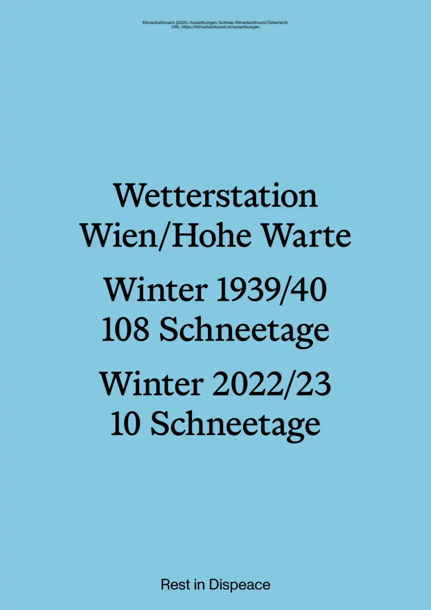 ... ich habe versucht, eine visuelle Sprache für die Folgen der Klimakrise zu finden, die mit unserem Alltag zu tun hat. Die Arbeit besteht aus zwölf Plakaten, die Fakten vermitteln. Der Titel der Serie Rest in Dispeace spielt zum einen auf das Verabschieden an, von Landschaften, Gewohnheiten und Sicherheiten. Außerdem soll es aber eine Aufforderung sein, sich mit den Umständen nicht abzufinden. Ich wollte eine Arbeit zu diesem Thema produzieren, die die Menschen auch erreicht – ohne moralischen Zeigefinger.