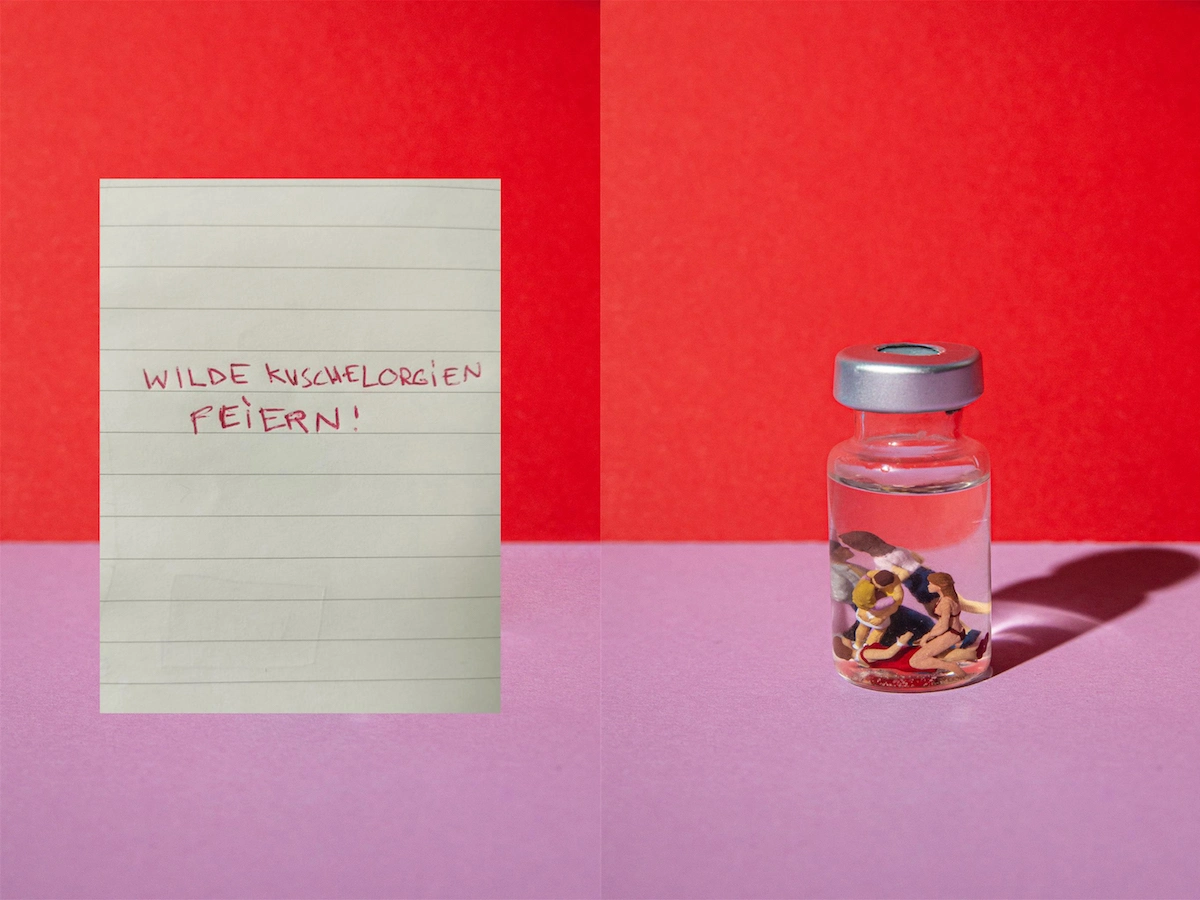 Das Fotografieren statischer Objekte ist natürlich auch geil, weil man sich kreativ austoben kann, aber mir fehlt dabei die persönliche Ebene! Das habe ich zum Beispiel bei meiner Fotoserie „Eine kleine Dosis Impfhoffnung“ bemerkt. Für die Serie habe ich auf Social Media eine Umfrage zu dem Thema gestartet, was man als Erstes tun würde, wenn die Impfungen wieder zu mehr Normalität führten. Aus den Sehnsüchten und Wünschen habe ich dann kleine Impffläschchen-Welten kreiert. Die Mini-Figuren, die ich dafür besorgt habe, konnte ich so hinstellen, wie ich wollte, – aber dafür fielen sie leicht um! (lacht)