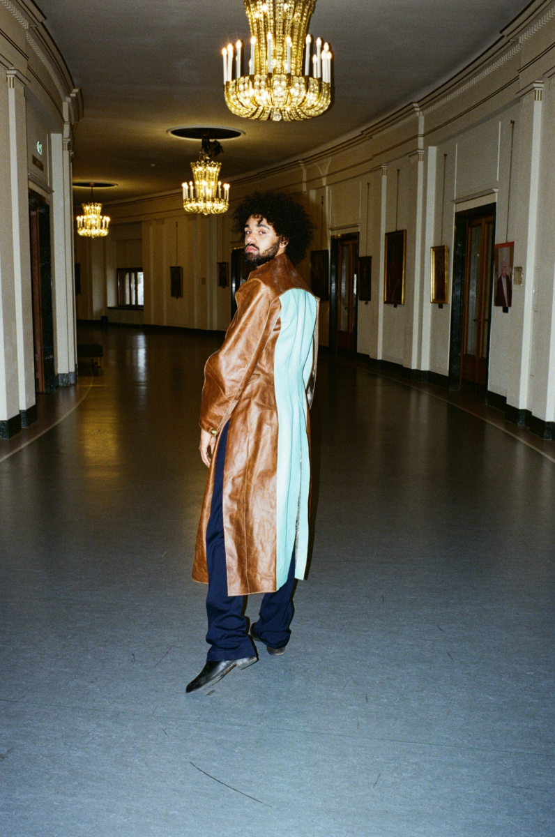 Shirt: Helmut Lang via Polyklamott, Leather coat: Niko Markovic, Shoes: Gucci (Langston's own)