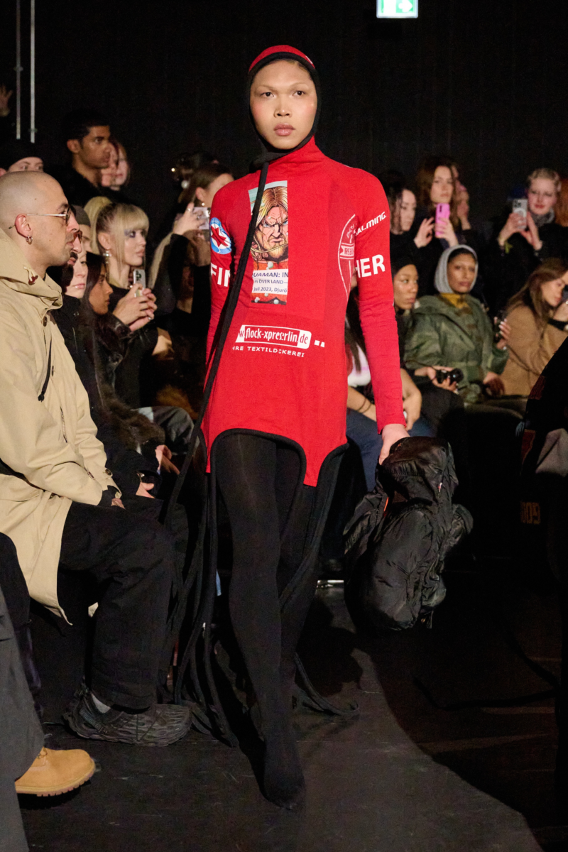 Die Farbe Rot, Layering und Zeitungsprints – die Zweitausender lassen grüßen – dominierten die Kollektion der Designerin. Der Großteil ihrer Kollektion folgt den Regeln des Upcyclings: Sie bezieht ihre Stoffe aus einer Einrichtung der Berliner Stadtmission, die Kleidung für Bedürftige sammelt und alles kiloweise verkauft, was keine Verwendung findet. Den Kreislauf des Lebens denken? Sich in den Problemen unserer digitalen Welt verheddern? Mode als nachhaltigen Kreislauf begreifen? Der Soundtrack von Berliner DJ Gigola und die Choreografie von Movement Direktorin Dafni Krazoudi lies vergessen, ob wir bei einer Fashion Show oder in einem Club sind! Das nennen wir ein würdiges Ende des Fashion-Week-Wahnsinns – bei Laura Gerte läuft's rund.