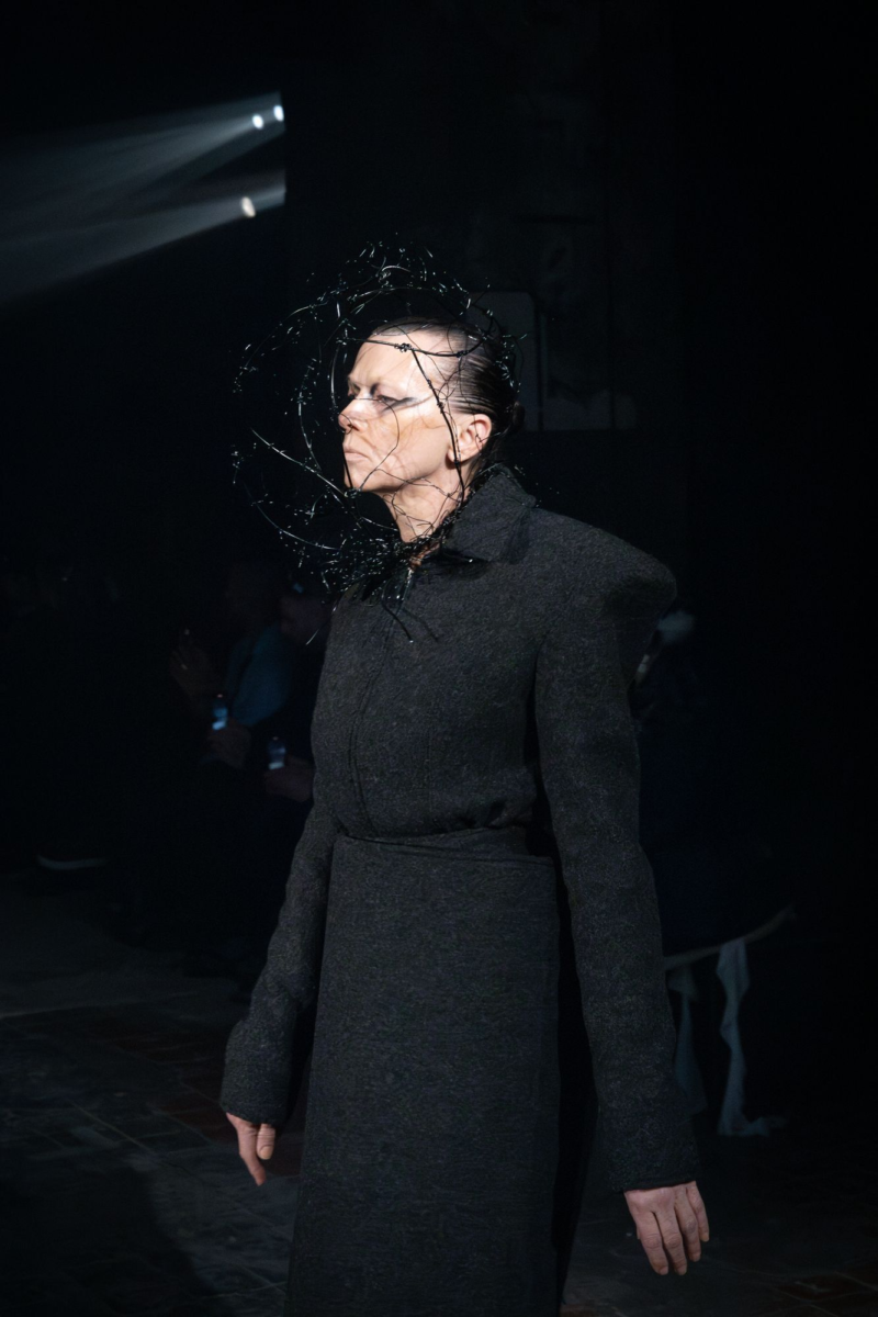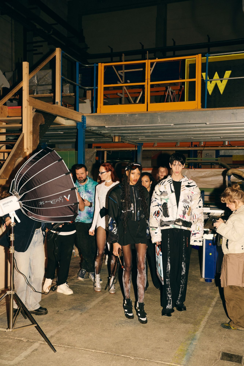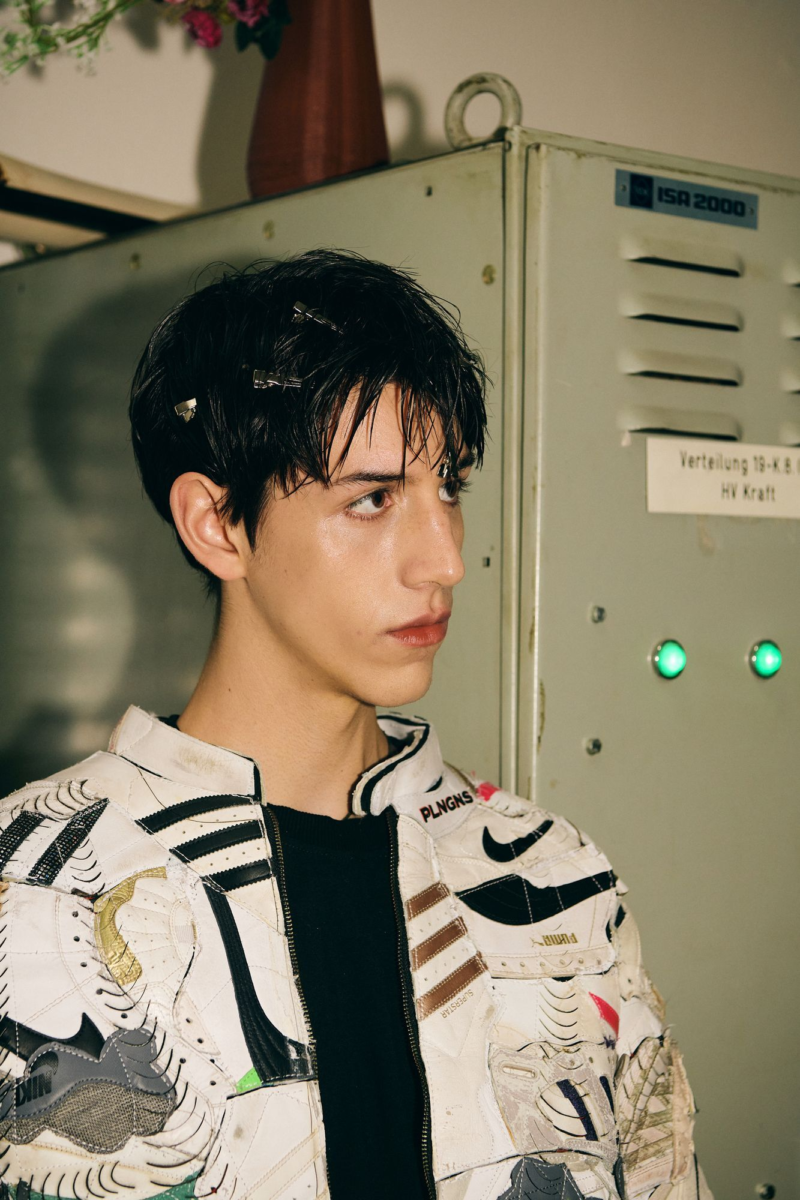 ... eine subtile Kampfansage gegen die schnelllebige Modewelt, Fast Fashion, ein Zeichen für Nachhaltigkeit? Bereits in seiner letzten Kollektion „Sneaker Riot" zerschnippelte er 500 Paar Schuhe und zeigte, dass sich auch hinter der Farbwahl (politische) Botschaften verstecken: Khaki symbolisiere den Krieg, Braun stehe für den Boden, den sie verteidigen, und Schwarz vermittle die Trauer über den Verlust! Auch diesmal sieht man viel Schwarz, aber Patchwork-Jacken, die an Schutzwesten erinnern, Knieschützer und helle Farbtöne machen der Dunkelheit Konkurrenz – ein Symbol für ihre Widerstandsfähigkeit? Der bewusste Einsatz von Stille ließ in der Lagerhalle am Rand von Berlin Zeit zum Nachdenken und Mode Schauen.