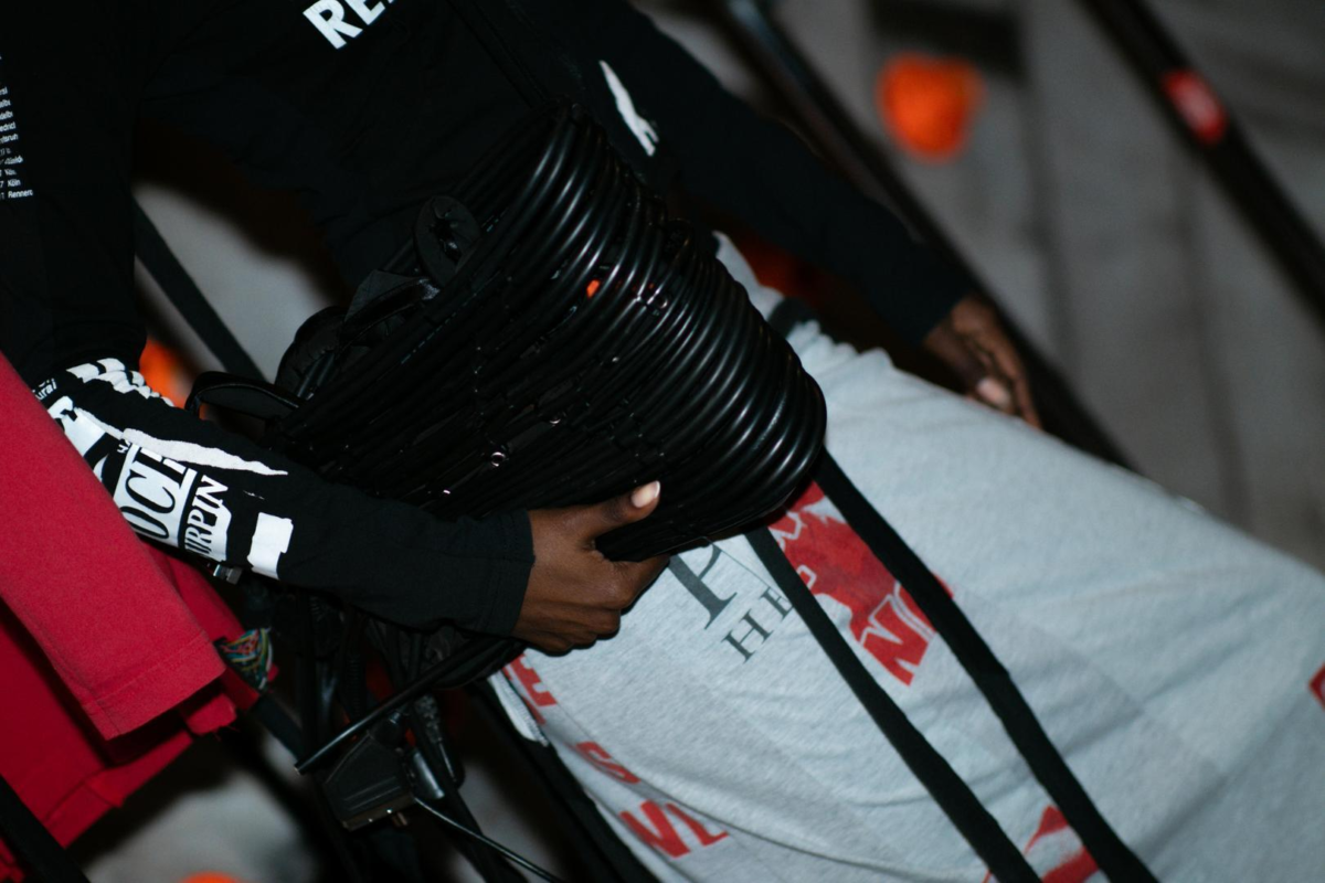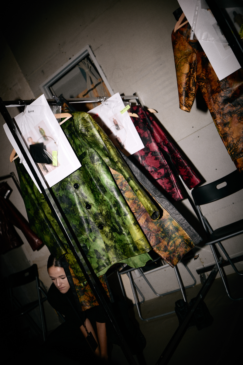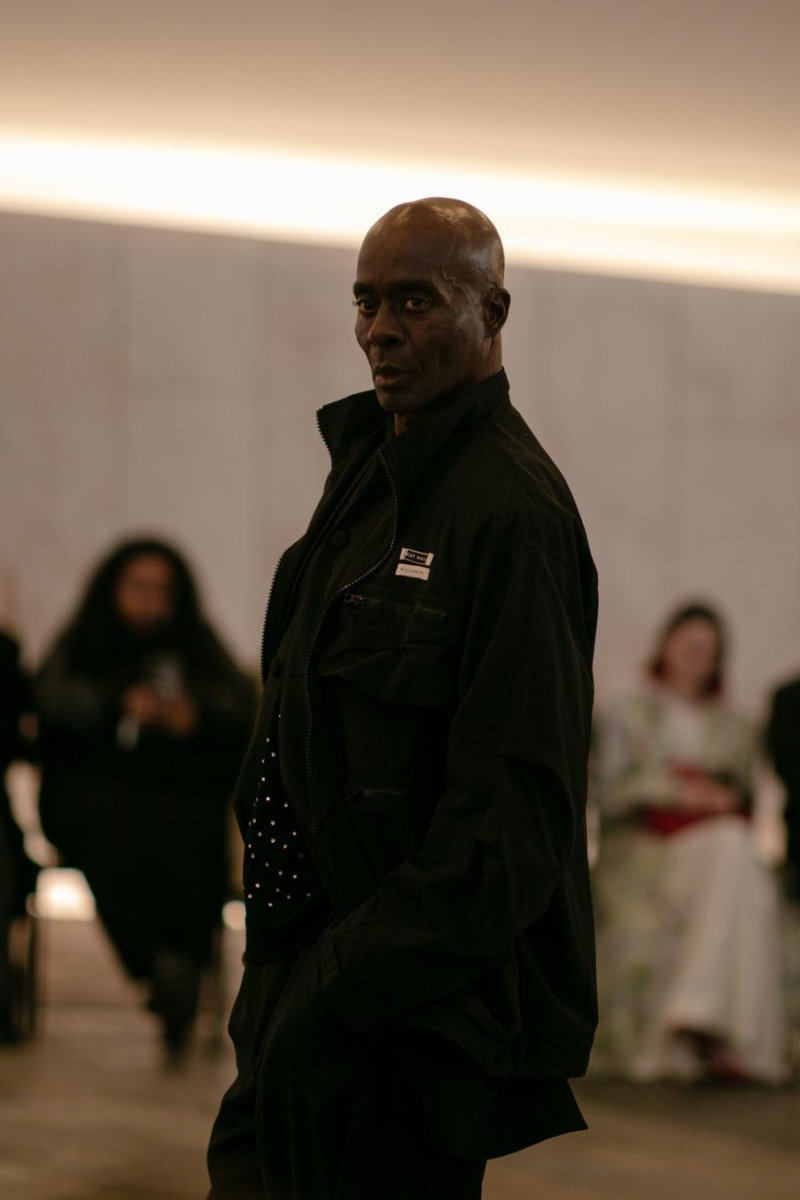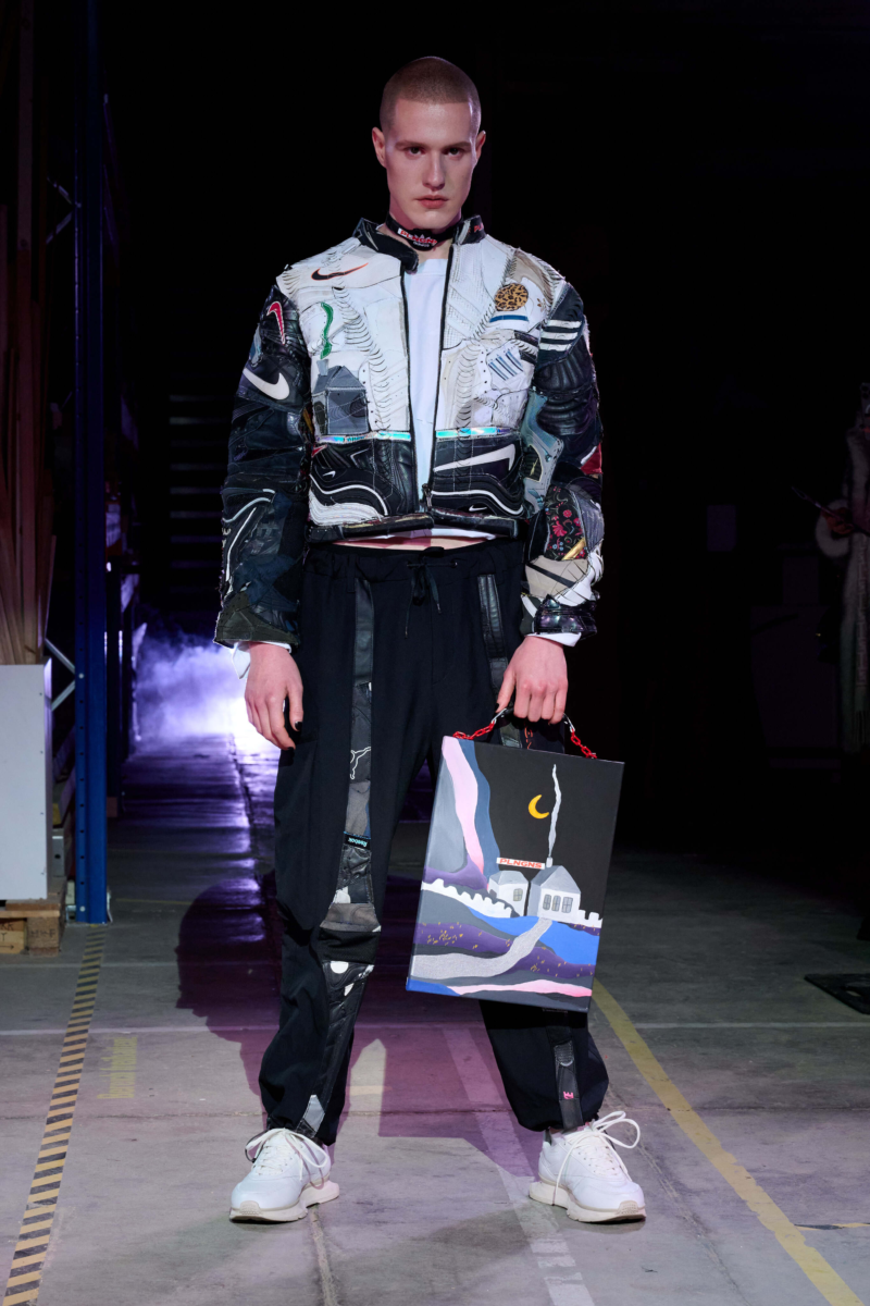 ... eine subtile Kampfansage gegen die schnelllebige Modewelt, Fast Fashion, ein Zeichen für Nachhaltigkeit? Bereits in seiner letzten Kollektion „Sneaker Riot" zerschnippelte er 500 Paar Schuhe und zeigte, dass sich auch hinter der Farbwahl (politische) Botschaften verstecken: Khaki symbolisiere den Krieg, Braun stehe für den Boden, den sie verteidigen, und Schwarz vermittle die Trauer über den Verlust! Auch diesmal sieht man viel Schwarz, aber Patchwork-Jacken, die an Schutzwesten erinnern, Knieschützer und helle Farbtöne machen der Dunkelheit Konkurrenz – ein Symbol für ihre Widerstandsfähigkeit? Der bewusste Einsatz von Stille ließ in der Lagerhalle am Rand von Berlin Zeit zum Nachdenken und Mode Schauen.