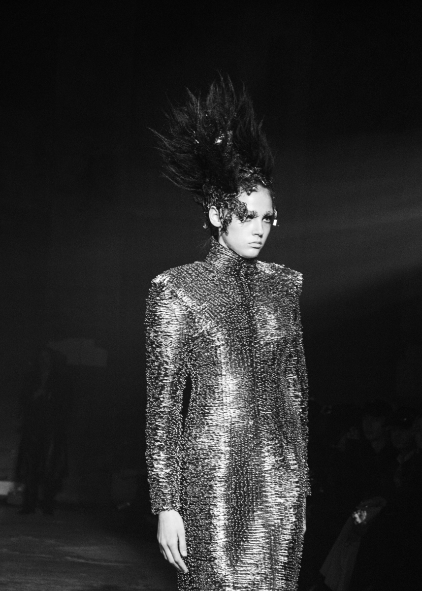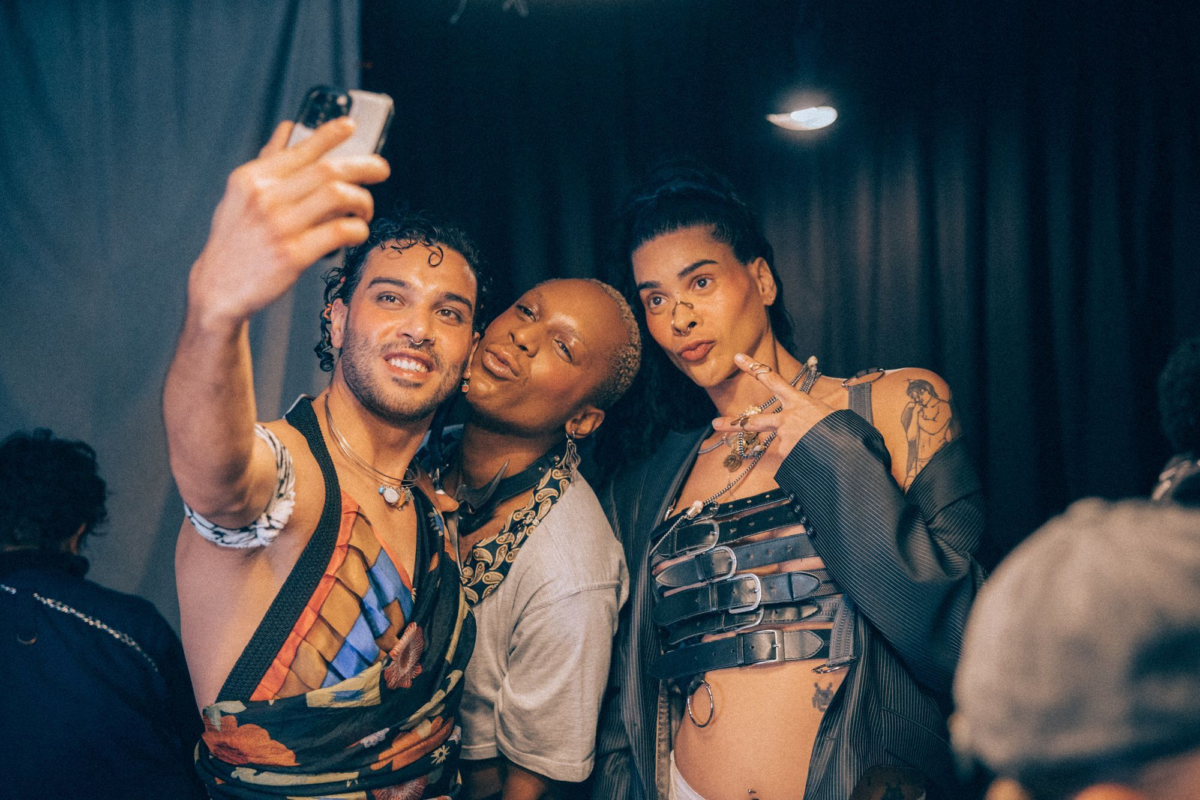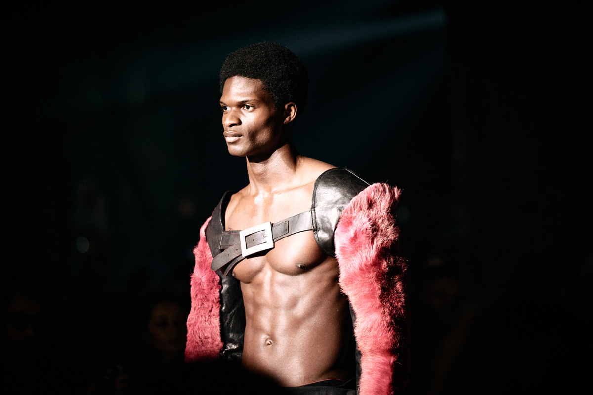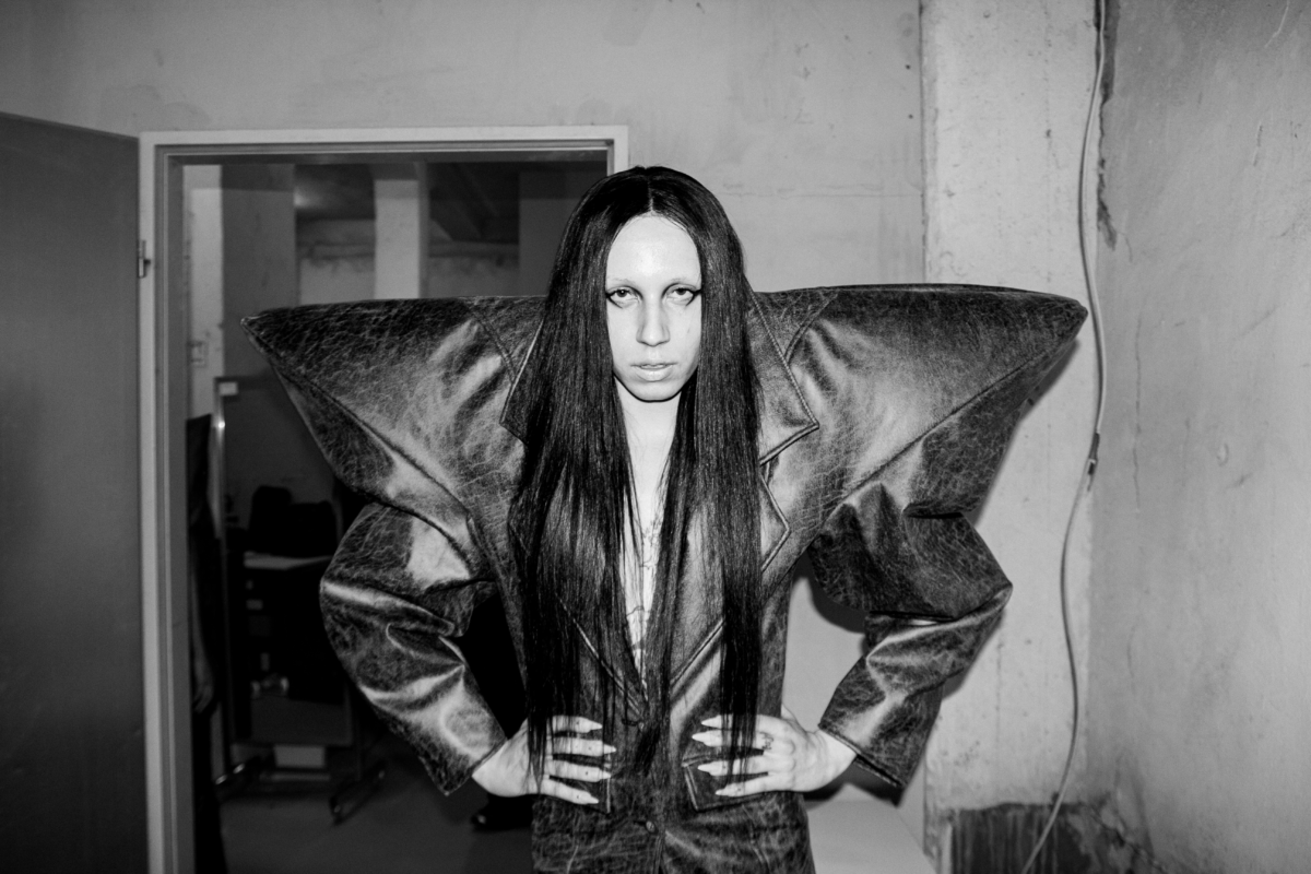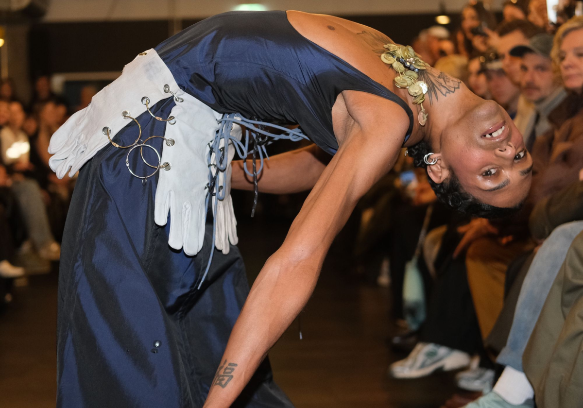 Mit Anzug ins Berghain: Der in Berlin lebende Designer Maximilian Gedra bringt mit seiner dritten Kollektion den klassischen Bürolook ins Wanken. Präzises Tailoring trifft auf extreme Proportionen: Schultern, meterbreit und in geometrischen Formen über den Kopf hinausragend, brechen mit Konventionen. Ungewöhnliche Materialkombinationen tun ihr Übriges. Ein Kleid, gehalten von 30.000 Sicherheitsnadeln, war nur eine der spektakulären Kreationen. Der finale Look? Ein Gesamtkunstwerk aus 30.000 mit der Hand angenähten, upgecycelten Knöpfen – 17 Kilogramm schwer. Chaos am Kopf: Haare und Textilien formten auf den Köpfen der Models skulpturale Gebilde. „Berlin Fashion Week bedeutet für mich absolute kreative Freiheit und die Möglichkeit, Mode als kraftvolle Plattform für Wandel und Inklusivität zu nutzen. Diese Stadt vereint Tradition und Avantgarde wie keine andere – genau das inspiriert mich, Grenzen neu zu definieren“, so Maximilian Gedra.