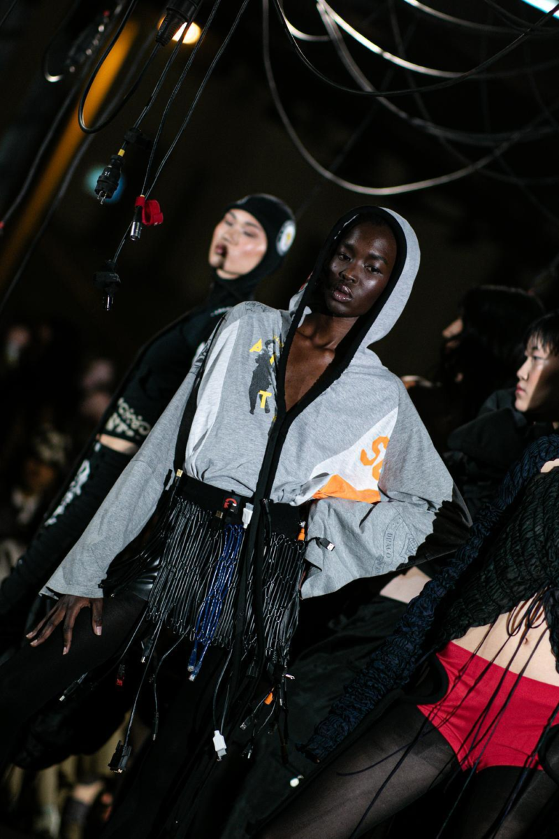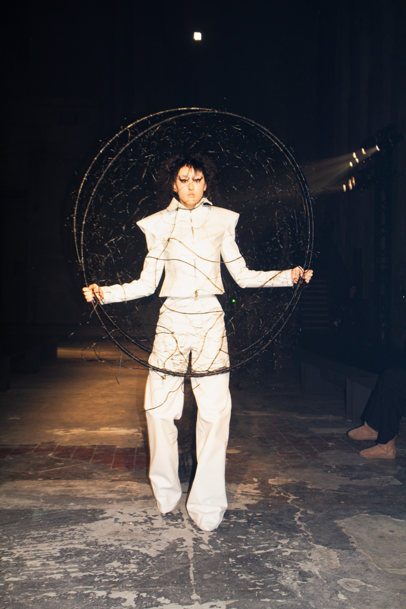 Wie viel Mensch, wie viel Maschine?Die Kollektion der jungen deutschen Designerin Laura Gerte, die 2019 ihren Bachelor an der Kunsthochschule Weißensee in Berlin absolvierte, ging den Cyborg-Theorien auf den Grund und erzählte eine Geschichte von Transformation und hybriden Zukunftsvisionen. Der Science-Fiction-Film „Ghost in the Shell" von Mamoru Oshii (1995) und „A Cyborg Manifesto" (1985) von US-Amerikanerin Donna Haraway, eine bedeutende feministische Denkerin und Wissenschaftshistorikerin der Gegenwart,inspirierten sie. Kabelelemente schlängelten sich durch die gesamte Kollektion, etwa verwoben zu einem Rock, und zogen sich durch den kreisförmig aufgebauten Laufsteg, fast wie in einem Labyrinth, bis in der Mitte alle Outfits miteinander verschmolzen.